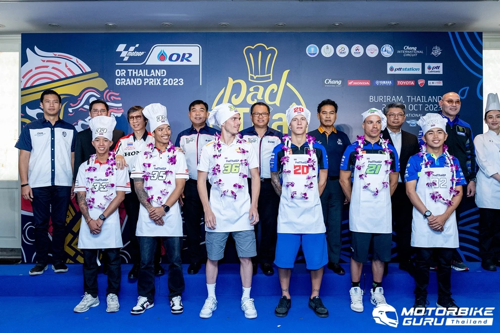 บรรยากาศภายในงานเริ่มจากขบวนกลองยาว การฟ้อนรำต้อนรับ โดยมีคณะผู้บริหารจากภาครัฐ-เอกชน ที่เป็นหัวเรือใหญ่ในการผลักดันให้เกิดงานโมโตจีพี สนามประเทศไทย นายสุรศักดิ์ เกิดจันทึก รองผู้ว่าการการกีฬาแห่งประเทศไทย ฝ่ายยุทธศาสตร์และเทคโนโลยีสารสนเทศ เป็นประธาน พร้อมด้วย นาย นิธี สีแพร รองผู้ว่าการด้านสื่อสารการตลาด การท่องเที่ยวแห่งประเทศไทย, นายสุชาติ ระมาศ ผู้อำนวยการใหญ่ บริษัท ปตท.น้ำมันและการค้าปลีก จำกัด (มหาชน) หรือ โออาร์ นายอารักษ์ พรประภา ประธาน บริษัท ไทยฮอนด้า จำกัด, นายวีรพงษ์ ธนากิจจานนท์ ผู้จัดการทั่วไป ฝ่ายกีฬายานยนต์ บริษัท ไทยยามาฮ่ามอเตอร์ จำกัด, นายสุรเชษฐ คล้ายแจ้ง ผู้อำนวยการสำนักมาตรฐานงานทะเบียนและภาษีรถ กรมการขนส่งทางบก และตนัยศิริ ชาญวิทยารณ์ กรรมการผู้อำนวยการ สนามช้างอินเตอร์เนชั่นแนลเซอร์กิต ร่วมให้การต้อนรับ มอบพวงมาลัย และมอบผ้ากันเปื้อนผัดไทยจีพีให้กับเหล่านักบิด