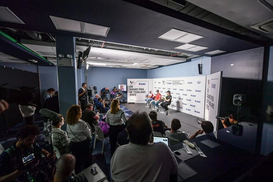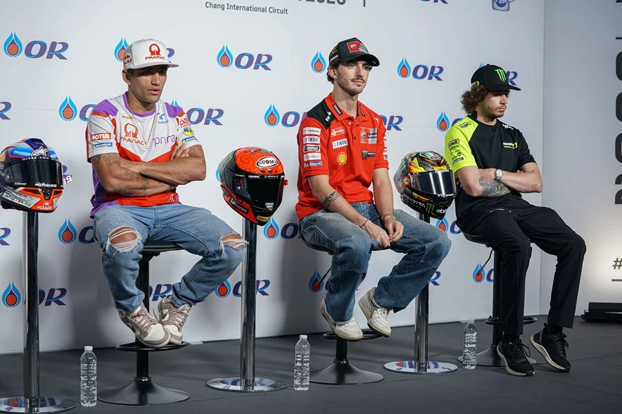 ยอดนักบิดชื่อดังในศึก MotoGP นำโดยแชมป์โลกอย่าง ฟรานเชสโก้ บันยาญ่า นักบิดอิตาเลียนจากดูคาติ และคู่แข่งคนสำคัญชาวสแปนิชอย่าง ฮอร์เก มาร์ติน และ มาร์โก เบซเซ็คคี รวมถึงสตาร์ชาวไทยอย่าง ก้อง-สมเกียรติ จันทรา จาก อิเดมิตสึ ฮอนด้า ทีม เอเชีย ร่วมแถลงข่าวก่อนแข่ง หลังลงสำรวจแทร็ก สนามช้าง อินเตอร์เนชั่นแนล เซอร์กิต จ.บุรีรัมย์ ก่อนลงดวลช่วงสำคัญในการลุ้นแชมป์โลกสุดสัปดาห์นี้ในศึก โออาร์ ไทยแลนด์ กรังด์ปรีซ์ ขณะแฟนชาวไทยตื่นตาตื่นใจรอชมเรซระดับโลกในบ้านเกิด