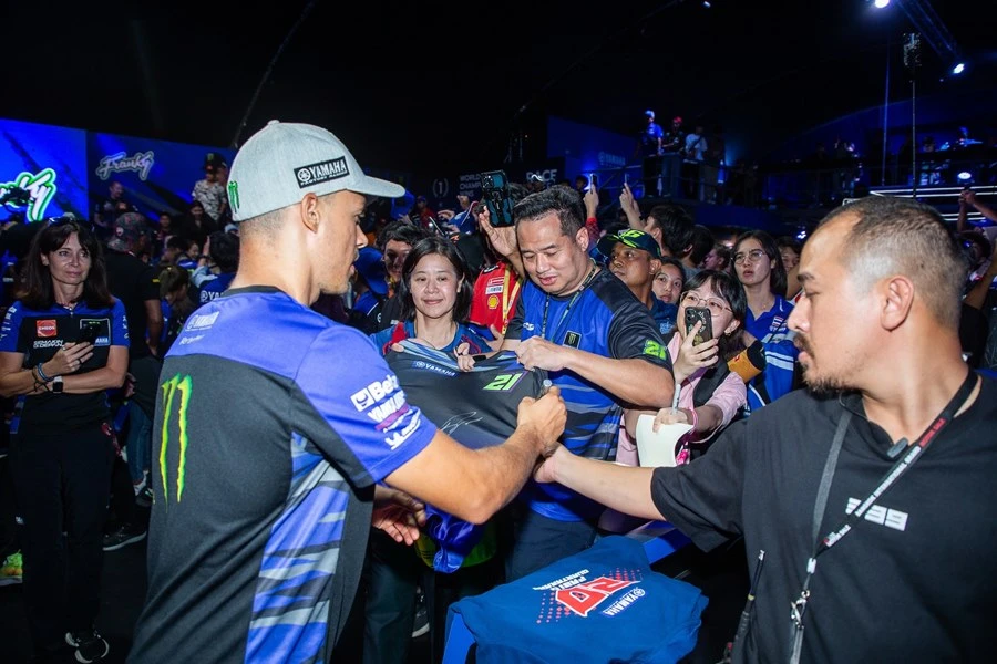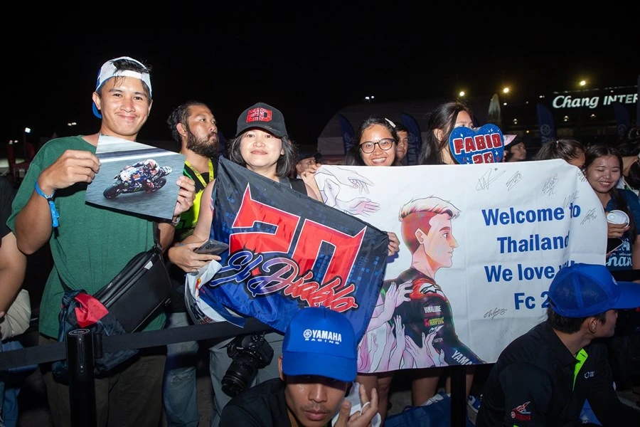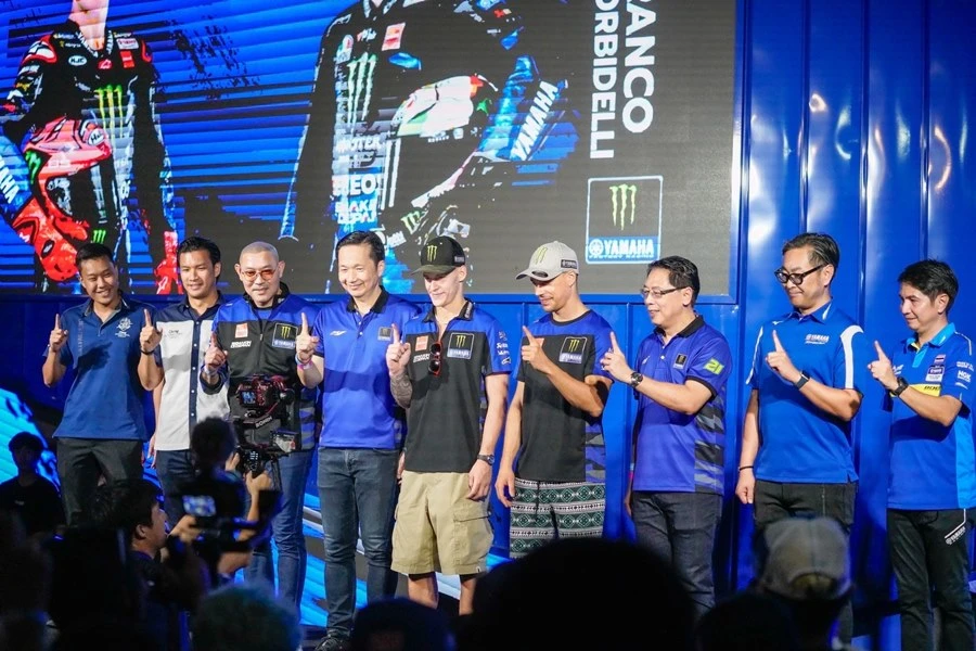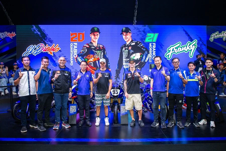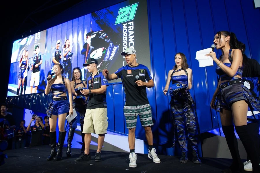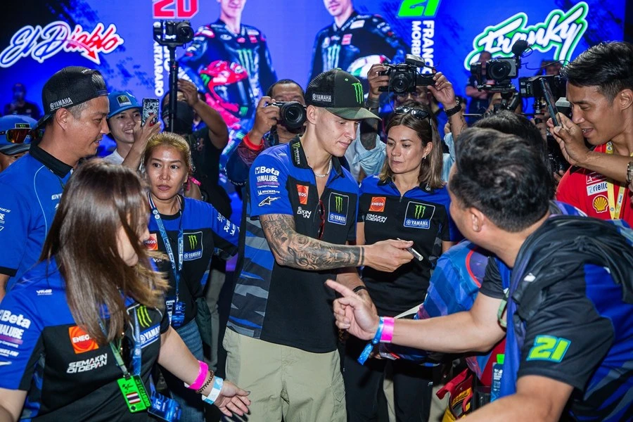 นายพงศธร เอื้อมงคลชัย รองประธานกรรมการบริหาร พร้อมด้วยผู้บริหารระดับสูง บริษัท ไทยยามาฮ่ามอเตอร์ จำกัด ให้การต้อนรับ เอลดิอาโบล ฟาบิโอ กวาร์ตาราโร #20 และนายพลแฟรงค์กี้ ฟรังโก มอร์บิเดลลี #21 นักแข่งชั้นนำของโลกสังกัด มอนสเตอร์ อีเนอร์จี้ ยามาฮ่า โมโตจีพีทีม ในกิจกรรม มีทแอนด์กรี๊ด ที่ยามาฮ่าจัดขึ้นให้กับแฟนๆ กีฬามอเตอร์สปอร์ตชาวไทยอย่างใกล้ชิด ที่บูธ YamahaGP Pavilion