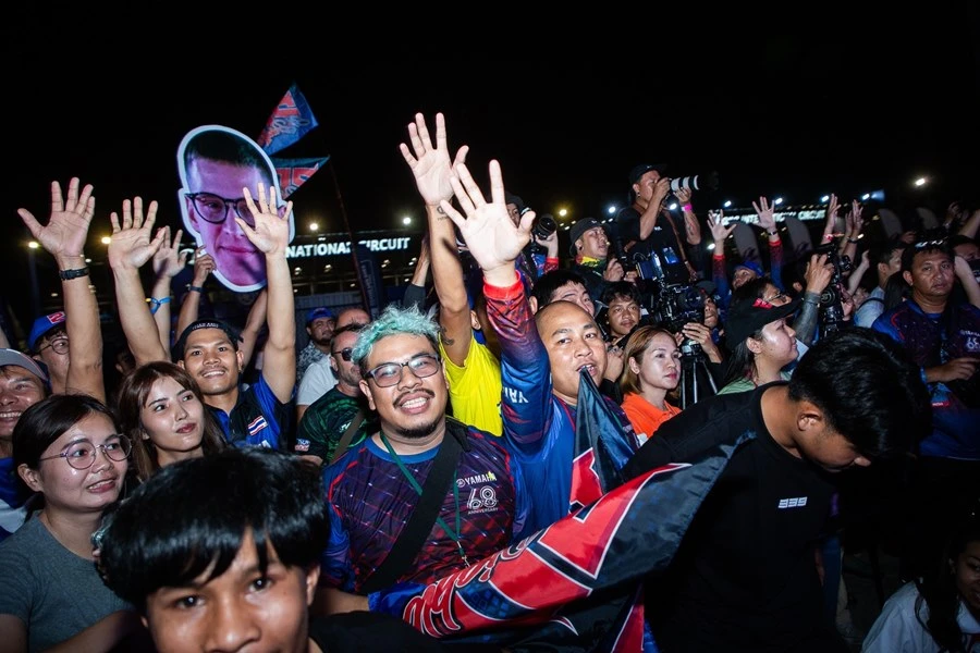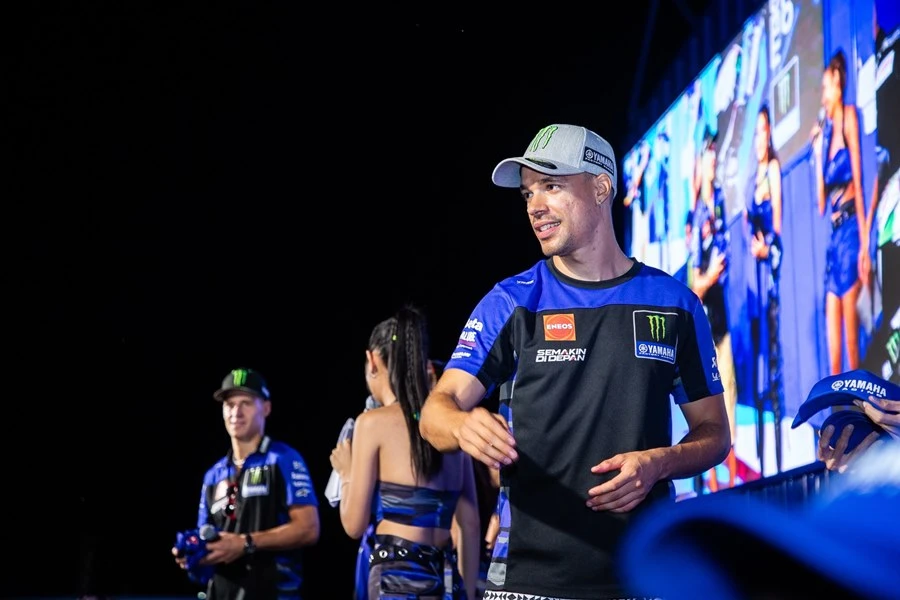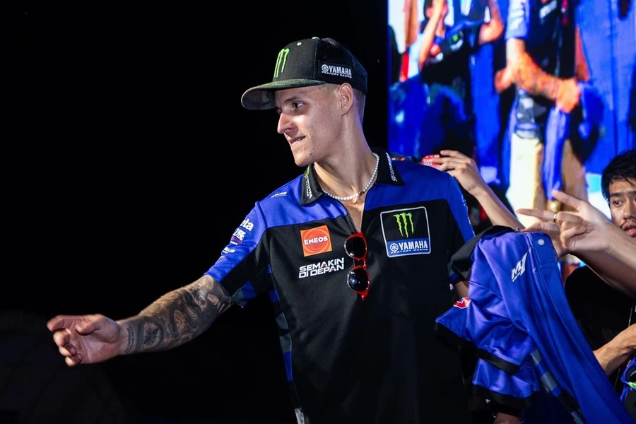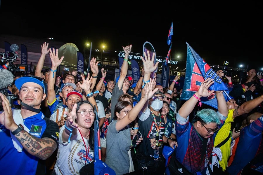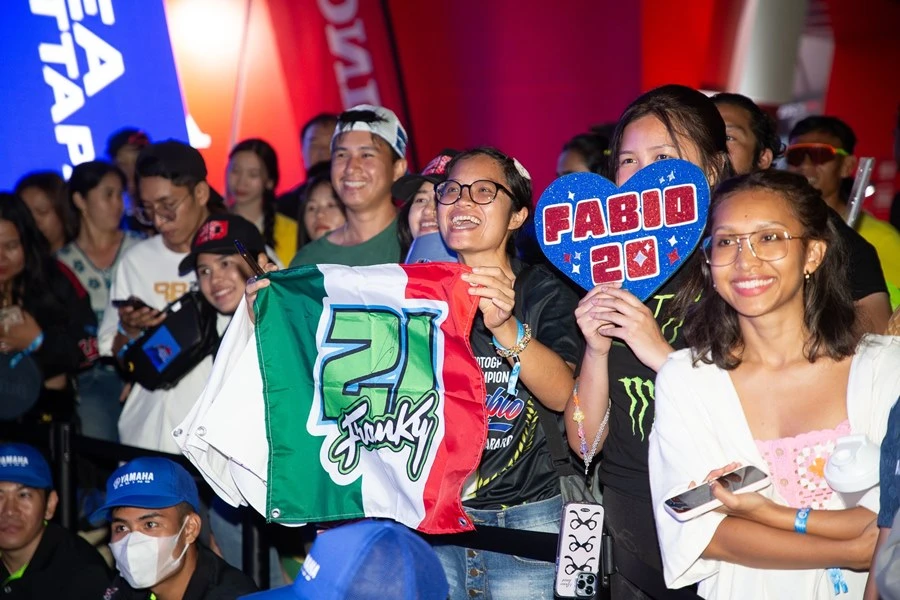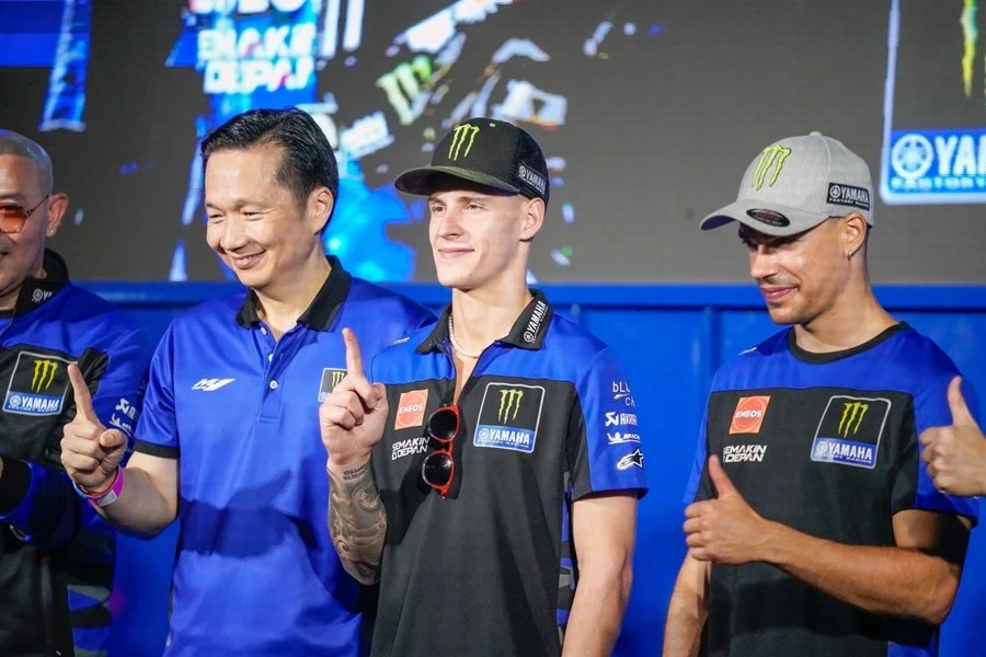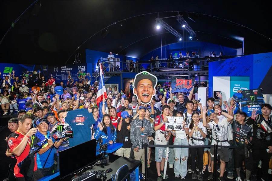 นายพงศธร เอื้อมงคลชัย รองประธานกรรมการบริหาร พร้อมด้วยผู้บริหารระดับสูง บริษัท ไทยยามาฮ่ามอเตอร์ จำกัด ให้การต้อนรับ เอลดิอาโบล ฟาบิโอ กวาร์ตาราโร #20 และนายพลแฟรงค์กี้ ฟรังโก มอร์บิเดลลี #21 นักแข่งชั้นนำของโลกสังกัด มอนสเตอร์ อีเนอร์จี้ ยามาฮ่า โมโตจีพีทีม ในกิจกรรม มีทแอนด์กรี๊ด ที่ยามาฮ่าจัดขึ้นให้กับแฟนๆ กีฬามอเตอร์สปอร์ตชาวไทยอย่างใกล้ชิด ที่บูธ YamahaGP Pavilion