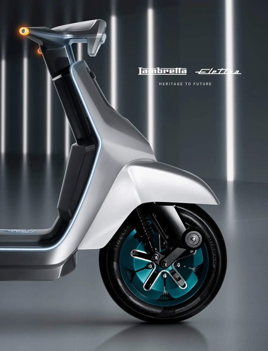 นอกจากนี้ ในโมเดล Elettra คันต้นแบบคันนี้ ยังมาพร้อมกับช่วงล่างเอกลักษณ์ กับระบบโช๊คด้านหน้าแบบ Double Arm-Link พร้อม ปั๊มเบรค Brembo รัดด้วยยางหน้า-หลัง ขนาด 12” จากแบรนด์สัญชาติเดียวกันอย่าง Pirelli แบรนด์ยางชื่อดังจากอิตาลี ส่วนทางด้านหลังออกแบบให้ใช้ช่วงล่างแบบ Push Rod หรือระบบช่วงล่างที่นิยมใช้กันในรถ Super bike และ Hyper Car คือการออกแบบให้มีการเคลื่อนที่ของสปริงโช๊คอัพไปในแนวระนาบแทน ซึ่งการวางแบบนี้ ในโมเดล Elettra จะสัมพันธ์กับการดีไซน์บอดี้ด้านข้างให้สามารถแคบลงได้ เพื่อให้ได้ฟีลลิ่งบอดี้สลิม รูปร่างเพรียว เมื่อมองจากทางด้านท้าย เหมือนกับโมเดลแลมเบรตต้าในอดีต อีกทั้งยังมีข้อดีที่ช่วยให้ช่วงล่างมีความนุ่มนวลมากกว่าแบบปกติทั่วไป