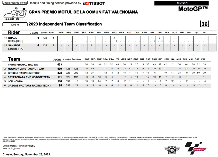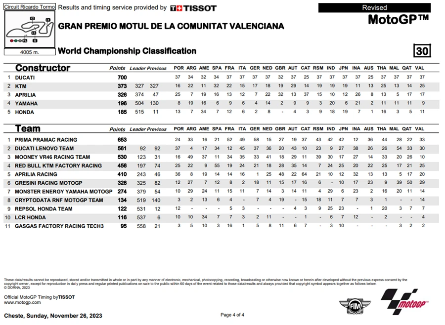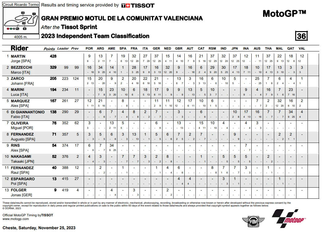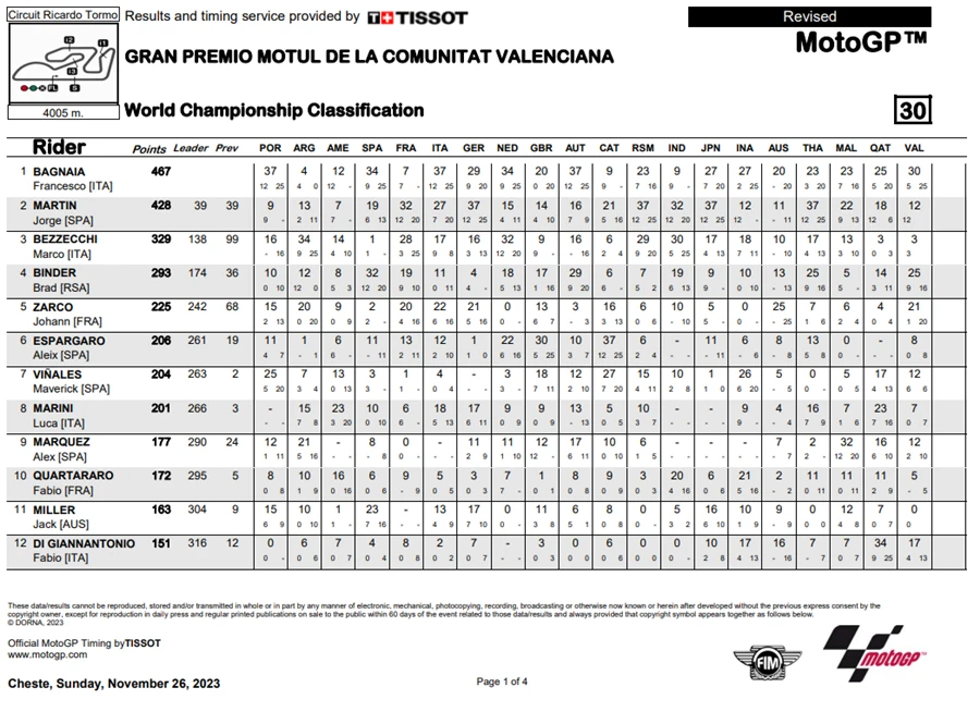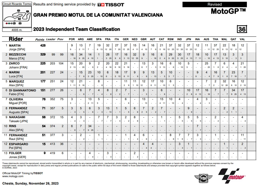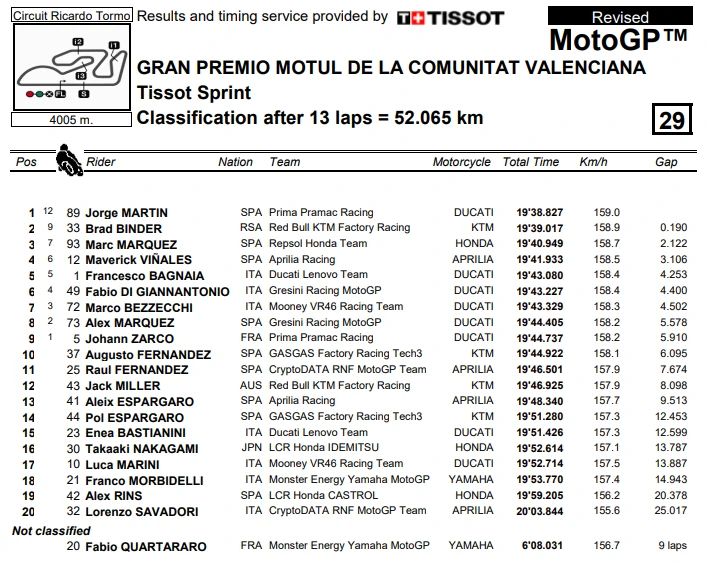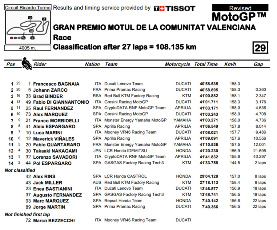 การแข่งขัน MotoGP 2023 ในสนามสุดท้ายที่ สเปน ในรายการ Gran Premio Motul de la Comunitat Valenciana เป็นการแข่งขันที่เรียกได้ว่าดราม่าสุด ๆ ในการชิงตำแหน่งแชมป์โลก โดยผู้ที่คว้าตำแหน่งไปได้ก็คือ Francesco Bagnaia จาก Ducati Lenovo Team หลังจากที่ Jorge Martin จาก Prima Pramac Racing ที่กำลังชิงตำแหน่งกันอยู่ พลาดล้มออกจากการแข่งขันหลังเกิดอุบัติเหตุกับ Marc Marques จาก Repsol Honda Team ทำให้ทั้งคู่ต้องออกจากการแข่งขันไปอย่างน่าเสียดาย โดยที่ Fabio Di Giannantonio จาก Gresini Racing MotoGP และ Johann Zarco จาก Prima Pramac Racing ผ่านเสัยชัยไป แต่ก็มีบทลงโทษสำหรับ Di Giannantonio หลังจากมีการตรวจพบว่าแรงดันลมยางต่ำกว่ากำหนด ทำให้ตกไปอยู่ในอันดับที่ 4 และขยับ Zarco ขึ้นมาเป็นที่ 2 และ Brad Binder จาก Red Bull KTM Factory Racing ขึ้นมาเป็นที่ 3