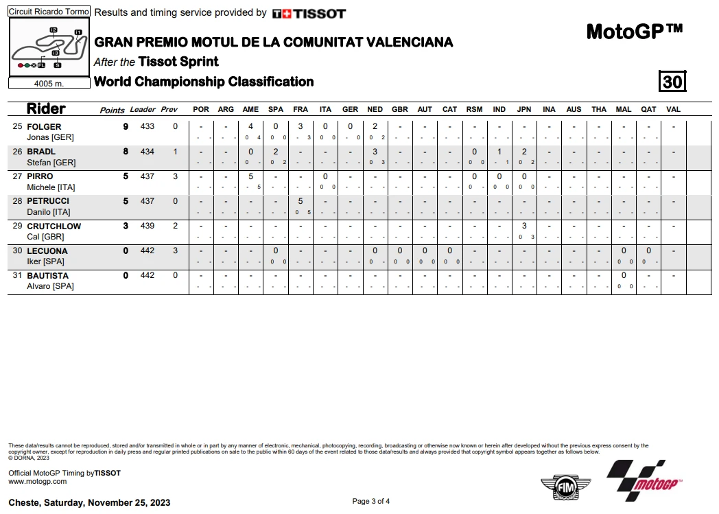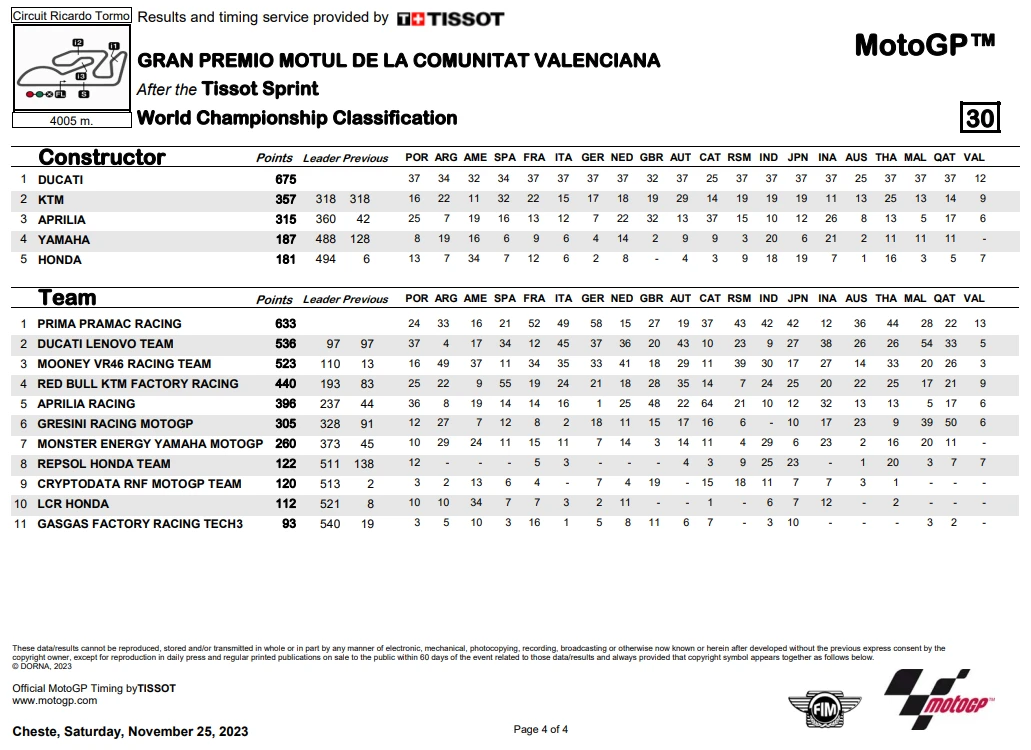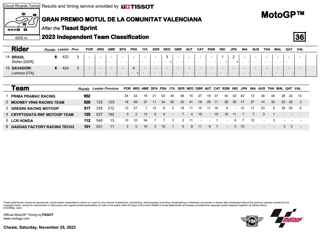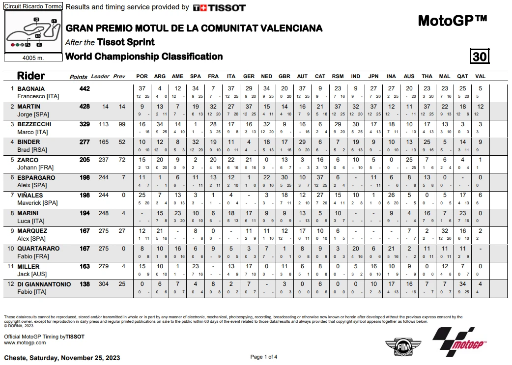 การแข่งขันในสนามนี้ เริ่มต้นกันด้วย Tissot Sprint Race ในวันเสาร์ เป็น Martin ที่เป็นผู้คว้าชัยไปได้ก่อน ทำให้ระยะห่างของคะแนนสะสมลดลงมาเหลือ 14 แต้ม ส่วน Bagnaia จบในอันดับที่ 5 ขณะที่ Binder และ M. Marquez ขึ้นโพเดี้ยมในการแข่ง Sprint Race สุดท้ายของปี 2023