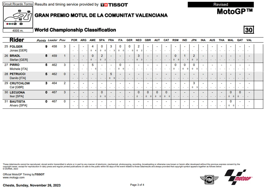 แต่นักบิดหางานในปีหน้าอย่าง Di Giannantonio ก็พยายามไล่ตามแชมป์โลกเพื่อหวังอันดับที่ดีที่สุด แต่สุดท้ายก็ไม่อาจแซงผ่าน Bagnaia ขึ้นไปได้ทำให้ Bagnaia เป็นแชมป์ประจำสนามรวมถึงแชมป์โลก MotoGP 2023 ไปในที่สุด ส่วน Di Giannantonio จบเป็นอันดับที่ 2 และ Zarco เป็นอันดับที่ 3 แต่ก็มีบทลงโทษสำหรับ Di Giannantonio หลังจากมีการตรวจพบว่าแรงดันลมยางต่ำกว่ากำหนด ทำให้ตกไปอยู่ในอันดับที่ 4 และขยับ Zarco ขึ้นมาเป็นที่ 2 และ Binder ขึ้นมาเป็นที่ 3