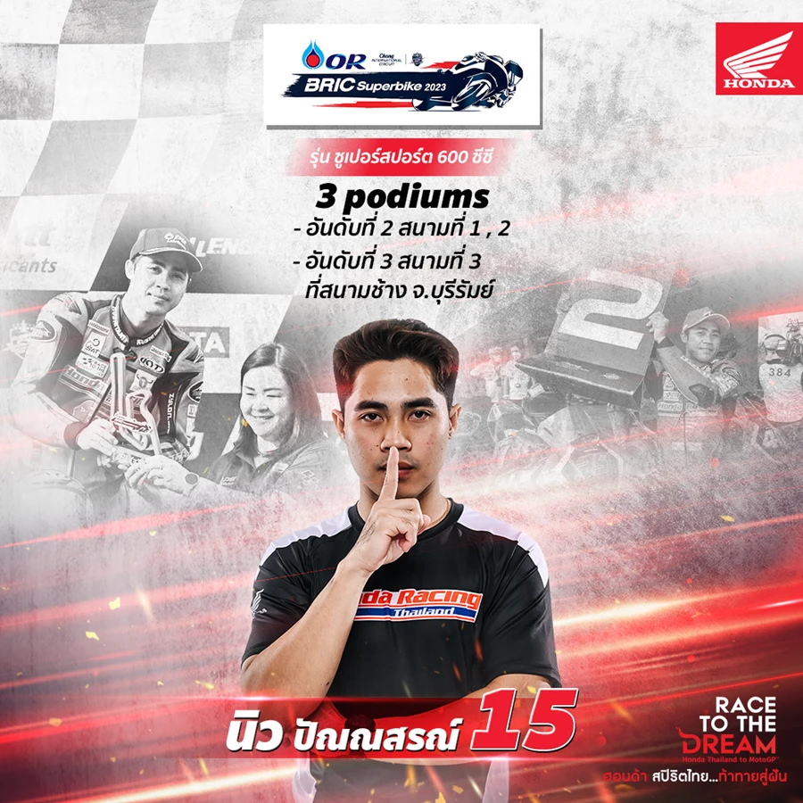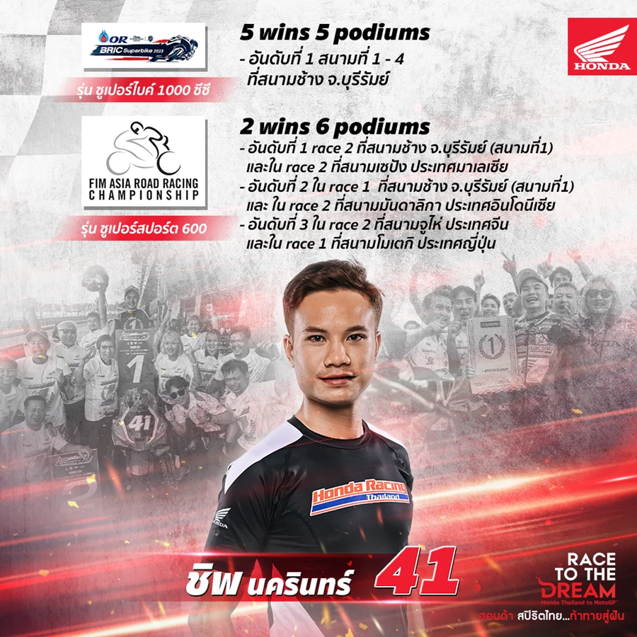 ความสำเร็จของโครงการ เรซ ทู เดอะ แชมเปี้ยน ชุดใหญ่ลุยศึก เอเชีย โร้ด เรซซิ่ง แชมเปี้ยนชิพ 2023 บิด CBR Series ลุ้นแชมป์ประจำปีกับยอดนักแข่งระดับท็อปของเอเชีย โดยรุ่น ซูเปอร์สปอร์ต 600 ซีซี (SS600) ยอดนักบิดไทย ชิพ-นครินทร์ อธิรัฐภูวภัทร์ บิดรถแข่ง Honda CBR600RR หมายเลข 41 คว้าท็อป 3 คะแนนสะสม กับ 2 ชัยชนะ 6 โพเดียม ส่วนทีมเมทอย่าง นิว-ปัณณสรณ์ แก้วสนธิ หมายเลข 15 รั้งอันดับ 9