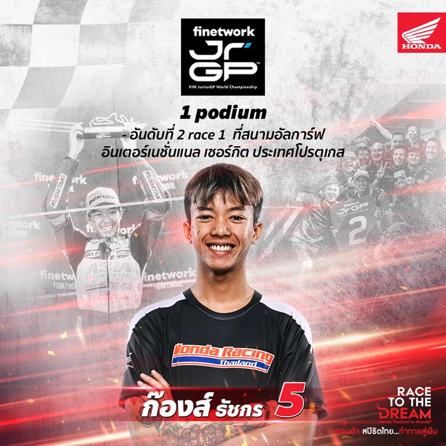 ดาวรุ่งไทย ก๊องส์-ธัชกร บัวศรี ฉายแววอย่างโดดเด่นในศึกดาวรุ่งชิงแชมป์โลกรายการ จูเนียร์จีพี เวิลด์ แชมเปี้ยนชิพ 2023 คว้า 1 โพเดียม รั้งอันดับ 11 ของโลก ขณะเดียวกันยังลงบิดไวลด์การ์ดใน โมโตทรีชิงแชมป์โลก 4 สนาม รวมถึงโฮมเรซในประเทศไทย แสดงให้เห็นพัฒนาการที่ยอดเยี่ยม ก่อนได้รับโอกาสขยับขึ้นสู่ โมโตทรี เวิลด์ แชมเปี้ยนชิพ 2024 ร่วมกับต้นสังกัด ฮอนด้า ทีม เอเชีย ซึ่งส่งผลให้ปีหน้า แฟนๆ ชาวไทยจะได้เชียร์ นักแข่งในระดับ เวิลด์ กรังด์ปรีซ์ ถึง 2 คน