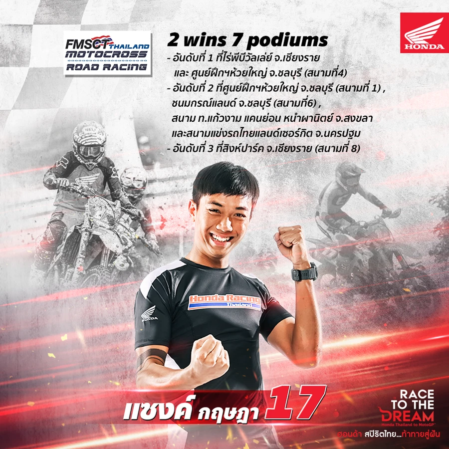 FMSCT Thailand Motocross 2023 ชิงแชมป์ประเทศไทย อินทรีแซงค์-กฤษฎา จำรูญจารีต ยอดนักบิดขวัญใจกองเชียร์ทางฝุ่นจากโครงการ เรซ ทู เดอะ แชมเปี้ยน เจ้าของแชมป์ประเทศไทย 4 สมัยติดต่อกัน พร้อมด้วยยอดรถแข่งทางฝุ่น Honda CRF250R หมายเลข 17 สังกัดทีม Honda Racing Thailand S Motor สู้สุดใจสมศักดิ์ศรีแชมป์ประเทศไทย ด้วยการมีอาการบาดเจ็บแต่ยังคงทำหน้าที่ของตัวเองออกมาได้ดีที่สุดในตำแหน่งรองแชมป์ ผลงานคว้า 2 ชัยชนะ 7 โพเดียม พร้อมกลับมาทวงบัลลังก์แชมป์อีกครั้งในฤดูกาลหน้า