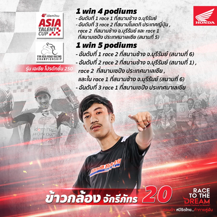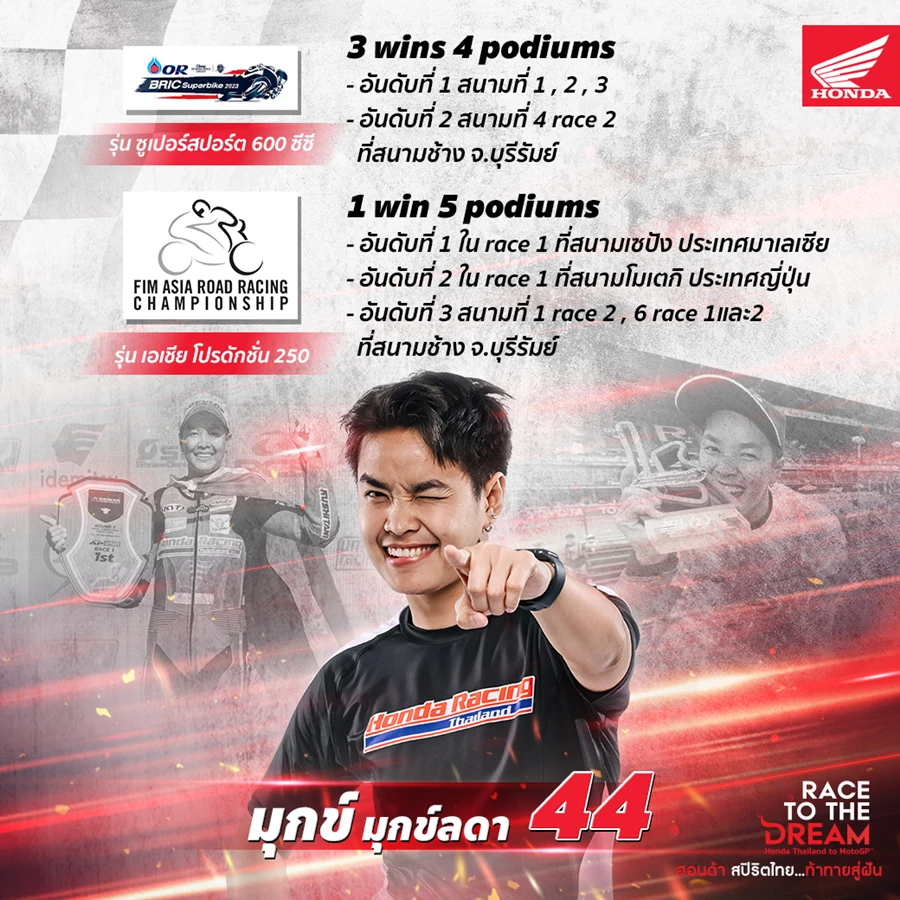 ไทยฮอนด้า ตอกย้ำความสำเร็จ กระหึ่มวงการมอเตอร์สปอร์ตตัวจริง ทั้งโครงการ เรซ ทู เดอะ ดรีม และ เรซ ทู เดอะ แชมเปี้ยน ด้วยผลงานกวาด 16 ชัยชนะ 44 โพเดียม ทั้งทางเรียบและทางฝุ่น ในทุกการแข่งขันในฤดูกาล 2023 พิสูจน์ให้เห็นถึงโครงสร้างที่แข็งแกร่งและความมุ่งมั่นในการพัฒนานักบิดตั้งแต่ระดับเยาวชน ฮอนด้า อะคาเดมี่ สู่ ฮอนด้า ไทยแลนด์ ทาเลนต์ คัพ ไปจนถึงนักบิดระดับอาชีพอย่างมีมาตรฐาน ทั้งรูปแบบหลักสูตรการพัฒนา ผู้ฝึกสอน และแนวทางการผลักดันนักบิดตั้งแต่พื้นฐาน เพื่อป้อนเข้าสู่การแข่งขันทุกระดับอย่างมั่นคง ตามแผนที่มุ่งเน้นพัฒนาศักยภาพนักบิดและทีมแข่ง วางเป้าหมายในระดับโลกที่วางไว้