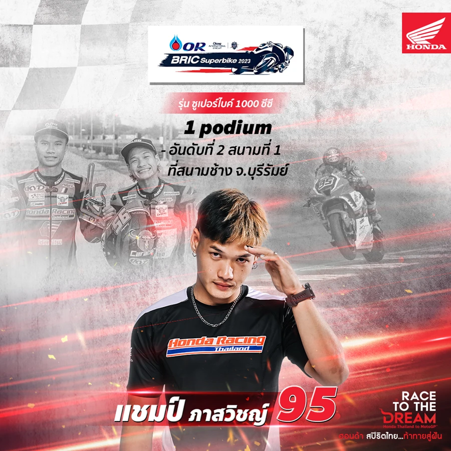 ศึก OR BRIC 2023 ทัพนักบิดและรถแข่งซูเปอร์สปอร์ตตระกูล CBR Series เหนือกว่าคู่แข่งอีกครั้ง ด้วยผลงานการคว้าแชมป์ 2 รุ่นท็อปของรายการ โดย ชิพ-นครินทร์ บิดรถแข่ง Honda CBR1000RR-R คู่ใจ หมายเลข 41 ผงาดคว้าแชมป์ประจำปีในรุ่น ซูเปอร์ไบค์ 1,000 ซีซี (SB1Pro) มาครองได้สำเร็จ ส่วนทีมเมทอย่าง“แชมป์-ภาสวิชญ์ คว้า 1 โพเดียม และได้รับบาดจนเจ็บพลาดลงแข่งหลายสนาม