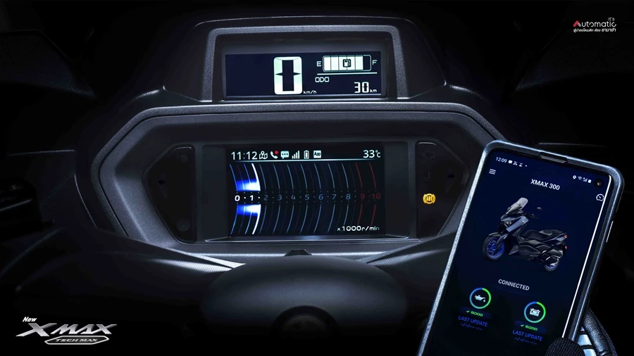 NEW XMAX Tech MAX ให้ความสุดเอ็กซ์คลูซีฟด้วย EXCLUSIVE THE MAX FEATURES ล้ำสมัยกับจอแสดงผลใหม่ พร้อมการเชื่อมต่อสมาร์ทโฟน เพื่อรองรับการใช้งานที่มากขึ้น โดยมาพร้อมกับ DUAL DISPLAYS เรือนไมล์แสดงผล 2 หน้าจอ เพิ่มคุณค่าและตอบสนองไลฟ์สไตล์ในการขับขี่ แสดงข้อมูลรถและการขับขี่ ข้อมูลจากสมาร์ทโฟน ตลอดจนฟังก์ชันระบบนำทาง บนหน้าจอสี TFT Infotainment 4.2 นิ้ว และจอ Digital LCD 3.2 นิ้ว แสดงผลมาตรวัดความเร็ว โดยสามารถเชื่อมต่อรถกับสมาร์ทโฟนผ่านแอปพลิเคชั่น Y-Connect เพื่อดึงข้อมูลต่างๆ ของรถจาก CCU มาแสดงบนหน้าจอสี TFT ได้ ซึ่งสามารถควบคุมการใช้งานได้อย่างง่ายดายด้วยสวิตช์บนแฮนด์ด้านซ้าย