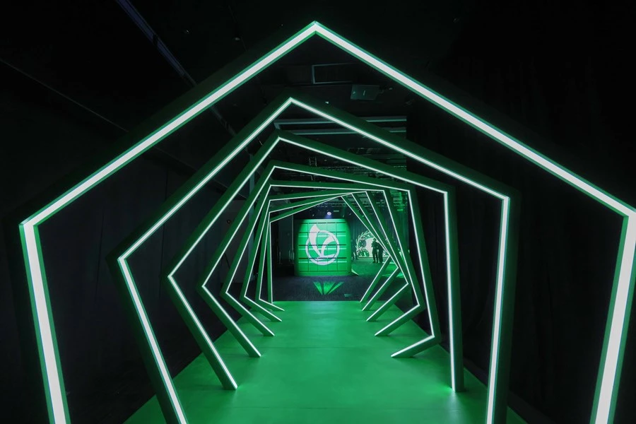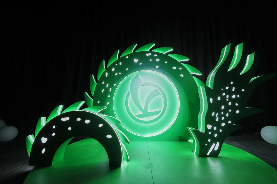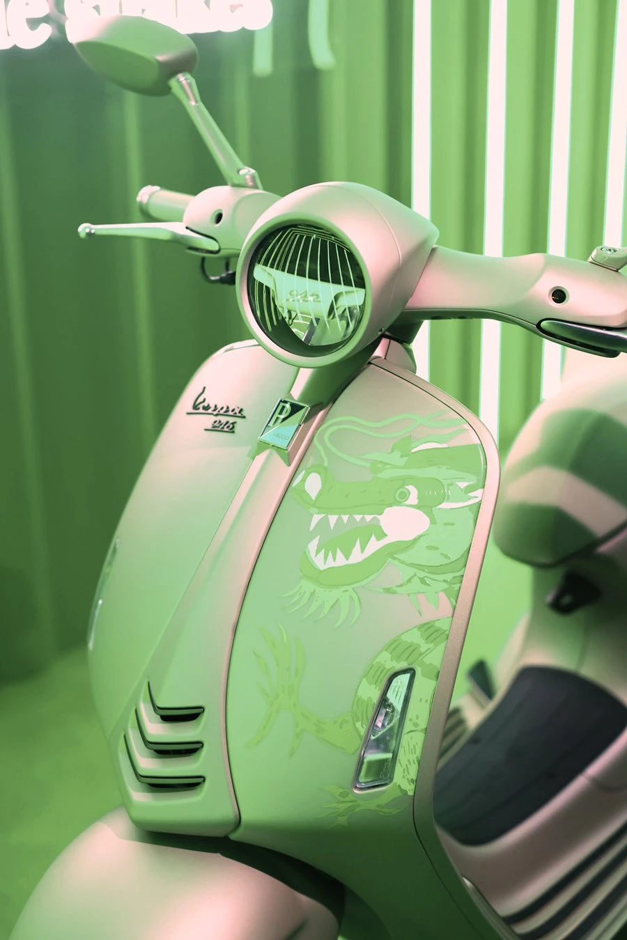 สีเขียวมรกตเฉดเดียวกับลายมังกรบน Vespa 946 Dragon ถูกใช้เป็นธีมสีหลักของปาร์ตี้ เริ่มจากอุโมงค์นีออนบริเวณทางเข้าที่ได้รับการออกแบบประหนึ่งประตูมิติที่พาแขกทุกท่านเข้าสู่โลกของ Vespa โดยเมื่อผ่านเข้ามาจะพบพระเอกของงานอย่าง Vespa 946 Dragon อวดโฉมอยู่ในตู้คอนเทนเนอร์สีเขียว ที่ตัดด้วยไฟนีออนสุดเท่ ตามด้วยไลฟ์ดีเจสุดชิคจาก DJ Xiaolin ผู้ทำหน้าที่คัดสรรบีทสนุก ๆ เติมเต็มช่วงเวลาอันแสนพิเศษตลอดค่ำคืน