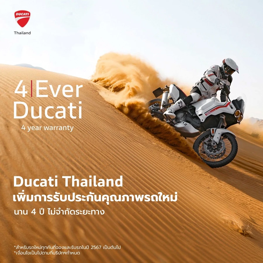 นายดอม เหตระกูล กรรมการผู้จัดการ บริษัท โมโตเร อิตาเลียโน จำกัด ผู้นำเข้าและจัดจำหน่าย รถจักรยานยนต์ ดูคาติ ในประเทศไทย อย่างเป็นทางการ เปิดเผยว่า เพื่อสร้างความพึงพอใจสูงสุดให้ลูกค้า ภายใต้กลยุทธ์บริการหลังการขายนำขาย ตั้งแต่เดือนมีนาคม 2567 นี้ ดูคาติ ประเทศไทย ได้มีการเพิ่มระยะเวลาการรับประกันตัวรถ หรือ วารันตี จากเดิม 3 ปีเป็น 4 ปี เพื่อเป็นการตอกย้ำถึงคุณภาพของรถดูคาติและสร้างความสบายใจให้กับลูกค้าทุกท่าน