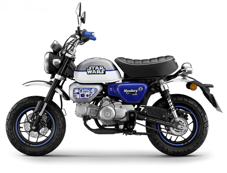 ฮอนด้า Monkey Star Wars Limited Edition : Light Side ดีไซน์กราฟิกบนตัวถังน้ำมันโทนสีขาว-น้ำเงิน หุ้มด้วยคาร์บอนไฟเบอร์สีเทาในธีมยานอวกาศ พร้อม Emblem โลโก้ Star Wars แสดงถึงเอกลักษณ์ของพลังที่โดดเด่น มาพร้อมฝาครอบข้างหุ้มคาร์บอนไฟเบอร์สีน้ำเงิน ให้ความสวยงามมีมิติ พร้อมสติกเกอร์ Monkey ที่สามารถเรืองแสงได้ในยามค่ำคืน และสติกเกอร์ยาน X-Wing ของฝั่ง Light Side เข้าคู่กับครอบกรองอากาศสีเทาที่มีตัวละคร R2-D2 เพิ่มเข้ามาทำให้โดดเด่นคู่กับสีสันที่ลงตัว