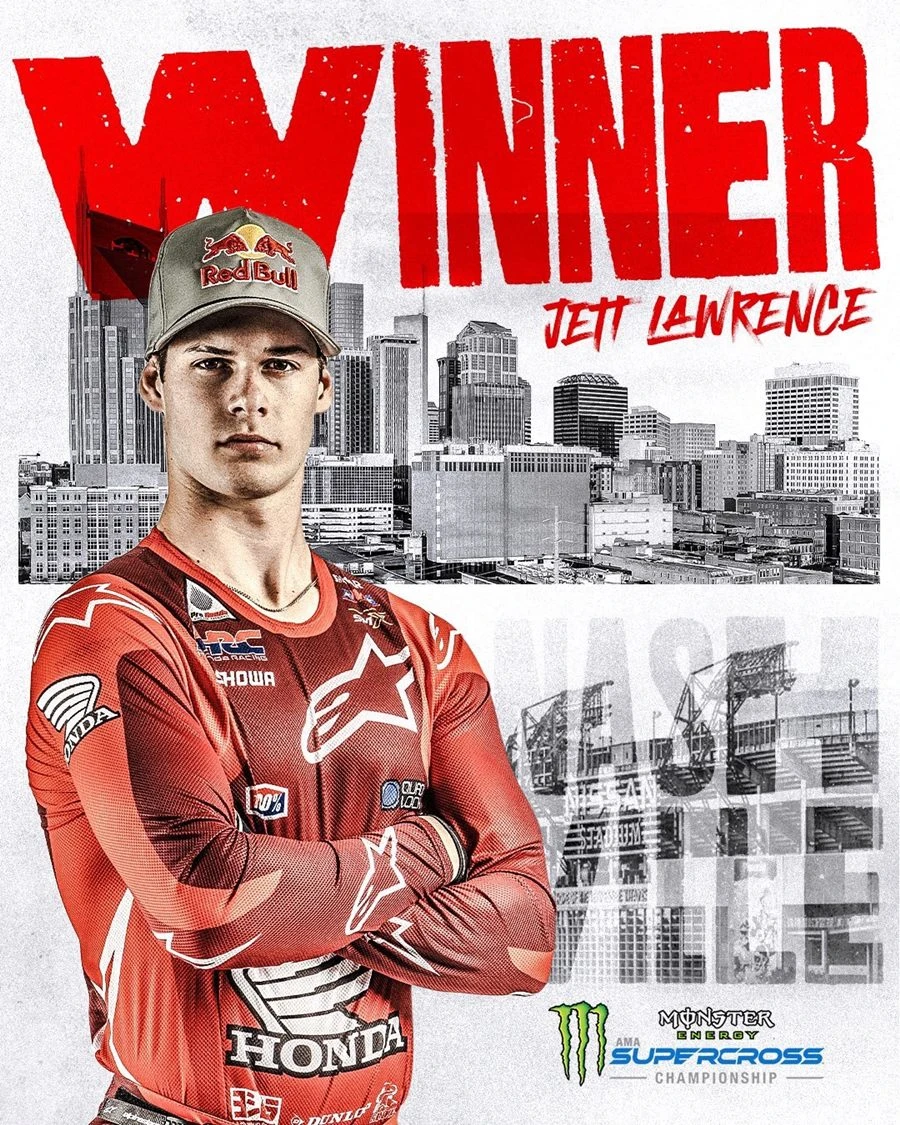เจ็ตต์ ลอว์เรนซ์ ยอดนักบิด Team Honda HRC บิดโชว์สมรรถนะยอดรถแข่งทางฝุ่น Honda CRF450R คว้าชัยชนะ รั้งอันดับที่ 1 ทิ้งห่างคะแนนคู่แข่งในตารางคะแนนแชมป์เปี้ยนชิพ ศึก AMA Supercross สนามที่ 14 เมื่อสุดสัปดาห์ที่ผ่านมา ที่ Nissan Stadium ใน Nashville ประเทศสหรัฐอเมริกา