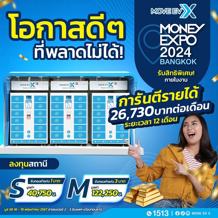 MOVE EV X (มูฟ-อี-วี-เอกซ์) ธุรกิจขายและให้บริการสถานีเปลี่ยนแบตเตอรี่สำหรับรถมอเตอร์ไซค์ไฟฟ้า จัดแสดงนวัตกรรมสะอาดหรือสถานีเปลี่ยนแบตเตอรี่ในงาน Money Expo 2024 เพื่อให้ผู้ประกอบการได้ชมการสาธิต และทดลองใช้งานสถานีเปลี่ยนแบตเตอรี่ของ MOVE EV X โดยผู้ประกอบการสามารถเริ่มต้นธุรกิจกับ MOVE EV X ในรูปแบบ S วงเงินการลงทุนเริ่มต้น 679,000 บาท และรูปแบบ M วงเงินการลงทุนเริ่มต้น 1,969,000 บาท