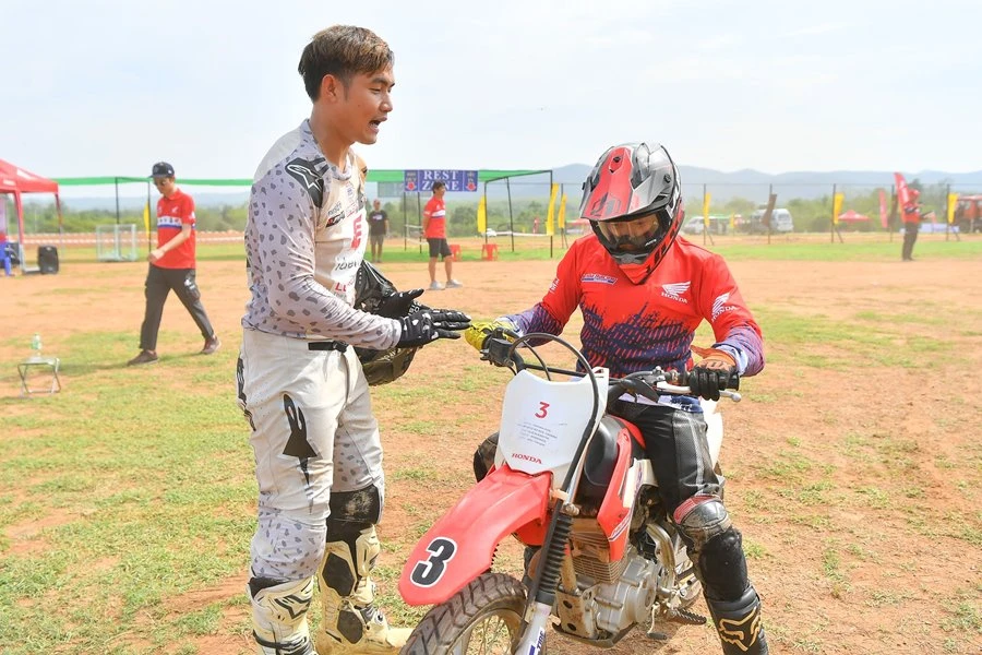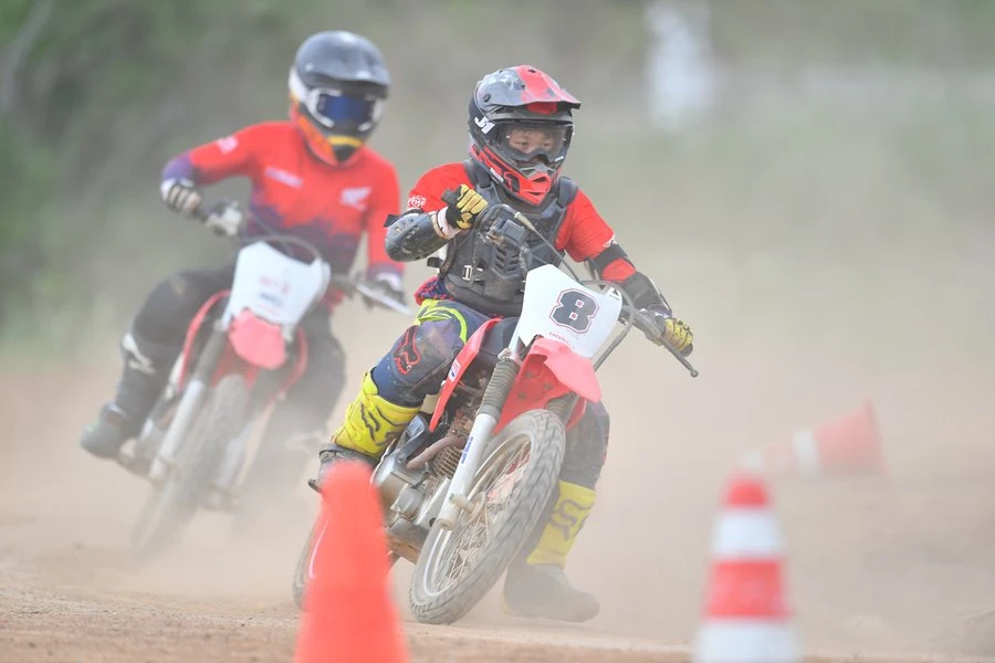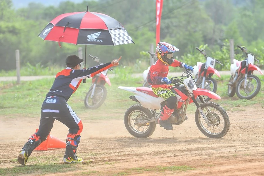 โดยเริ่มการฝึกฐานเบสิก วนซ้าย-วนขวาในรูปเลขแปด เพื่อความแม่นยำในเรื่องของการใช้เกียร์ การใช้เบรก การควบคุมรถ ด้วยจังหวะคันเร่งและการลดเกียร์ต่อเกียร์ให้แม่นยำ ตามด้วยการฝึกลงแทร็กขับขี่แบบทางฝุ่น (Flat Track) ที่ให้นักแข่งเยาวชนสัมผัสรถแข่งทางฝุ่น Honda CRF125R แบบกดคันเร่งกันจนฝุ่นคลุ้ง และเพิ่มความสนุกสร้างความท้าทายวัดความสามารถในการนำความรู้มาประยุกต์ใช้กับเกม ซูเปอร์โพล ที่มีโพเดียมเป็นรางวัล และที่ไม่ได้ยืนโพเดียมจะต้องเพิ่มพลังกันด้วยการวิดพื้นกันไป