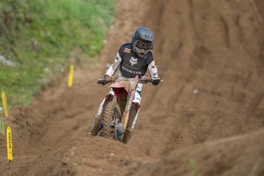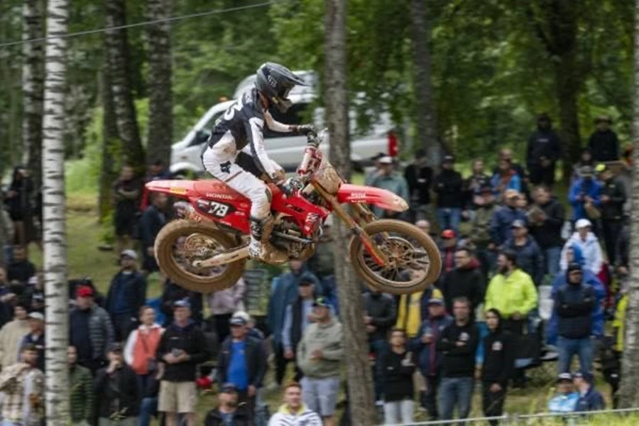 ศึก MXGP 2024 สนามที่ 9 รายการ MXGP of Latvia ในเรซที่ 1 ทิม ไกเซอร์ ควง Honda CRF450R หมายเลข 243 บิดต่อสู้กับสภาพสนามที่ลื่นเป็นอย่างมากและโคลนในโค้งจากสายฝนที่ตกลงมาก่อนการแข่งขัน ซึ่งแม้จะพลาดคว้าโฮลช็อต ยังคงผลงานเข้าเส้นชัยได้ในอันดับที่ 2