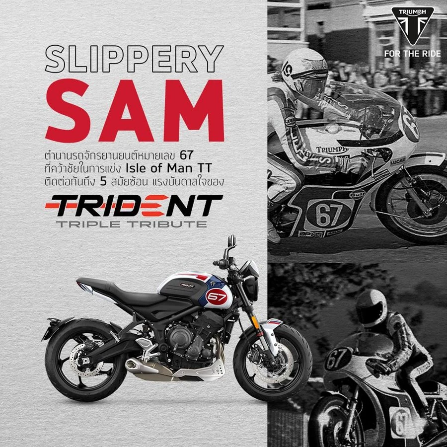 สำหรับรถจักรยานยนต์ไทรอัมพ์รุ่น Trident Triple Tribute มีการออกแบบที่ทันสมัยและน่าทึ่ง โดยได้รับแรงบันดาลใจจากรถจักรยานยนต์ที่โด่งดังที่สุดตลอดกาลอย่าง Slippery Sam ซึ่งเป็นรถจักรยานยนต์คันเดียวที่ชนะการแข่งขัน TT ถึง 5 ครั้งเป็นระยะเวลา 5 ปีติดต่อกัน ตั้งแต่ปี 1971 ถึง 1975 ที่มาพร้อมรูปแบบสีขาว น้ำเงิน และแดงพร้อมชิลด์หน้าและแผงใต้ท้องรถที่สีเข้าชุดกัน โดดเด่นจากเส้นสายที่เรียบง่ายสะอาดตา ภาพเงาที่สวยงาม และสไตล์ของรถไทรเดนท์ที่ส่งมอบความมั่นใจ