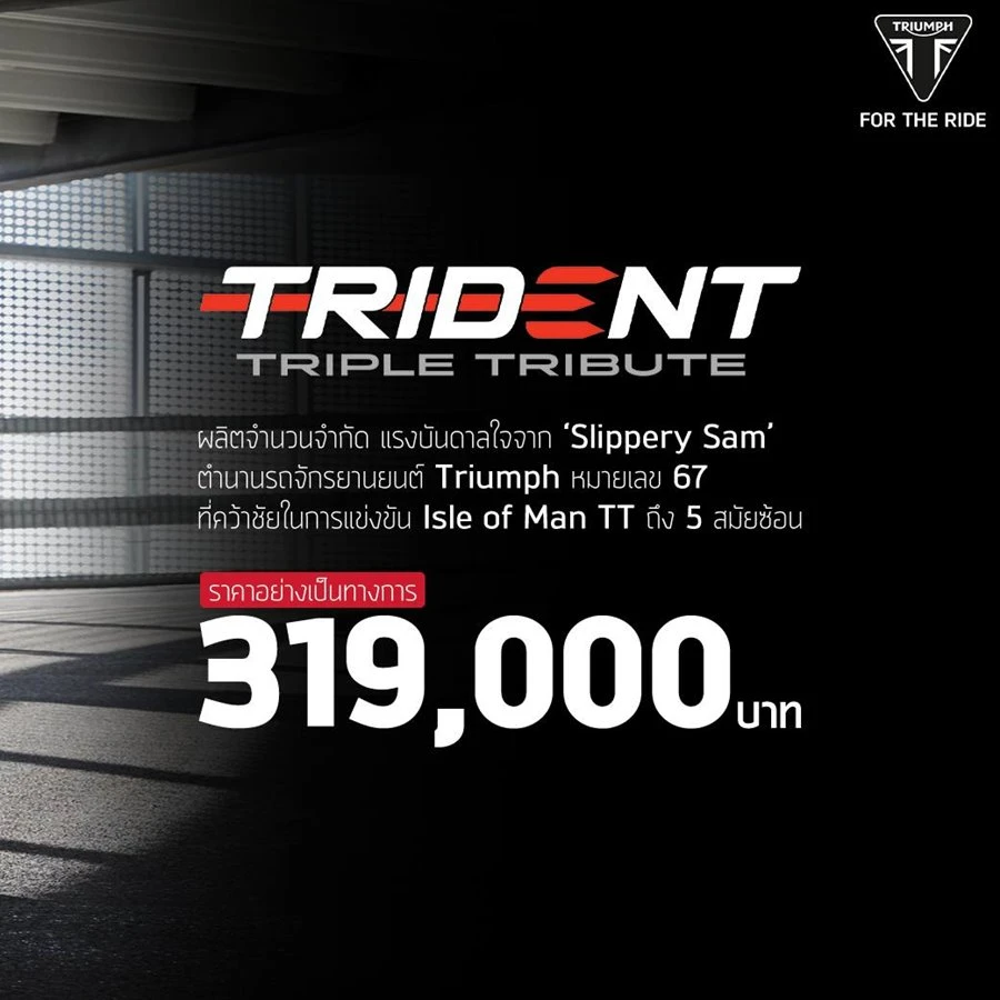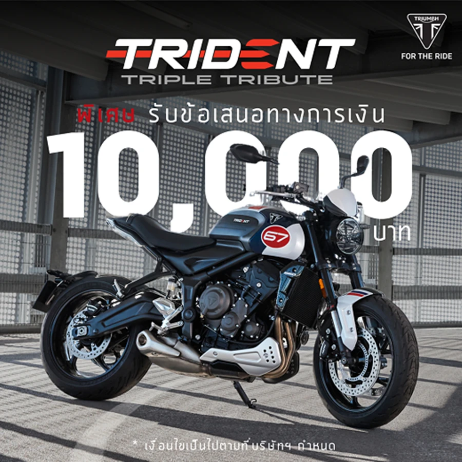 รถจักรยานยนต์ Trident Triple Tribute รุ่นพิเศษ วางจำหน่ายในราคา 319,000 บาท พิเศษ! รับข้อเสนอทางการเงิน 10,000 บาท ตั้งแต่วันที่ 8 - 31 กรกฎาคม 2567 โดยผู้ที่สนใจสามารถติดต่อได้ที่ผู้แทนจำหน่ายไทรอัมพ์ 12 แห่งทั่วประเทศ