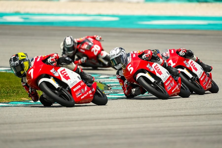 สามนักบิดดาวรุ่งไทย บิด Honda NSF250R ต่อสู้กับนักบิดดาวรุ่งของเอเชีย ในศึก อิเดมิตสึ เอเชีย ทาเลนต์ คัพ 2024 สนามที่ 2 นำโดย ไม้คิว-เกียรติศักดิ์ สิงหพงศ์ หมายเลข 20 ร่วมด้วย ออสติน-ธนฉรรต ประทุมทอง หมายเลข 5 และ จิมมี่-บูรพา วันมูล หมายเลข 10