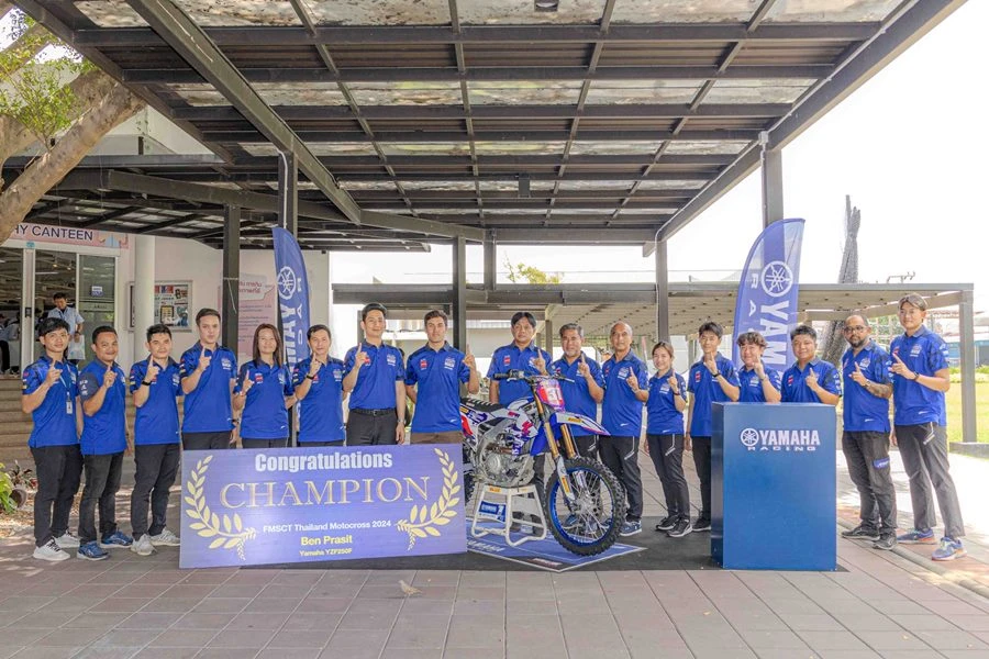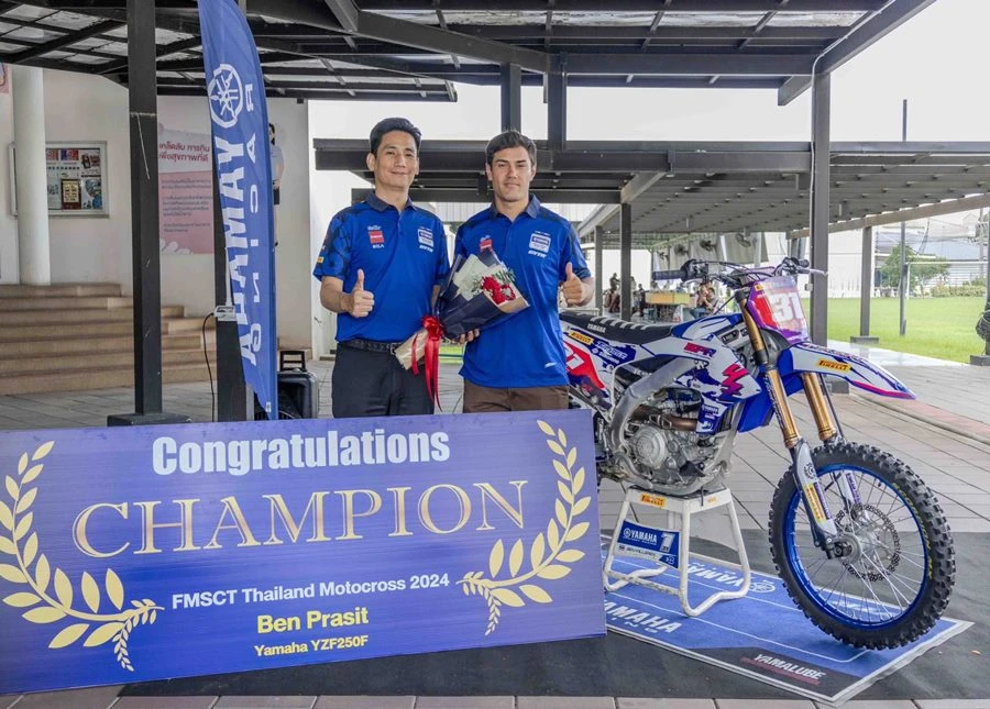 นายอุกฤษณ์ ภาควิวรรธ รองผู้จัดการใหญ่ด้านวางแผนการค้า และการตลาด, นายวีรพงษ์ ธนากิจจานนท์ ผู้จัดการทั่วไปฝ่ายกีฬายานยนต์ พร้อมคณะผู้บริหาร YAMAHA THAILAND RACING TEAM, บริษัท ไทยยามาฮ่ามอเตอร์ จำกัด ร่วมกันมอบช่อดอกไม้ และแสดงความยินดีกับ เบน ประสิทธิ์ ฮัลเกรน นักแข่งในสังกัด YAMAHA Ben Prasit Racing