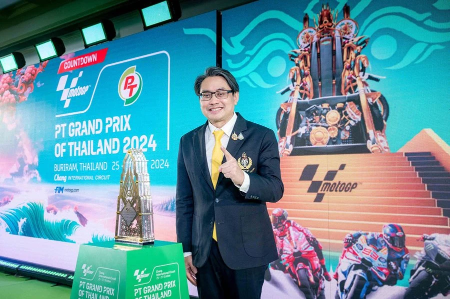 กระทรวงการท่องเที่ยวและกีฬา โดย การกีฬาแห่งประเทศไทย จัดแถลงข่าวนับถอยหลังการแข่งขันรถจักรยานยนต์ทางเรียบชิงแชมป์โลก หรือ โมโตจีพี ที่ประเทศไทยเป็นเจ้าภาพ ภายใต้ชื่อรายการ PT Grand Prix of Thailand 2024 ศึกสองล้อที่เร็วที่สุดและยิ่งใหญ่ที่สุดในโลก ระหว่าง 25- 27 ตุลาคม 2567 ที่ สนามช้าง อินเตอร์เนชั่นแนล เซอร์กิต จ.บุรีรัมย์ โดย ดร.ก้องศักด ยอดมณี ผู้ว่าการการกีฬาแห่งประเทศไทย เป็นประธาน พร้อมด้วยผู้สนับสนุนภาครัฐและเอกชน นำโดย จังหวัดบุรีรัมย์, การท่องเที่ยวแห่งประเทศไทย, กรมการขนส่งทางบก, บริษัท พีทีจี เอ็นเนอยี จำกัด (มหาชน), บริษัท ไทยเบฟเวอเรจ จำกัด (มหาชน) โดยน้ำแร่ธรรมชาติตราช้าง, บริษัท ไทยฮอนด้า จำกัด, บริษัท ไทยยามาฮ่ามอเตอร์ จำกัด, บริษัท โมโตเร อิตาเลียโน จำกัด (ดูคาติ ไทยแลนด์) รวมทั้ง อินฟลูเอนเซอร์ แพร-ทวินันท์ เพิ่มพูน และ ป้อง-ณวัฒน์ กุลรัตนรักษ์ ทัพสื่อมวลชน-ผู้สนับสนุนร่วมงานมากมาย