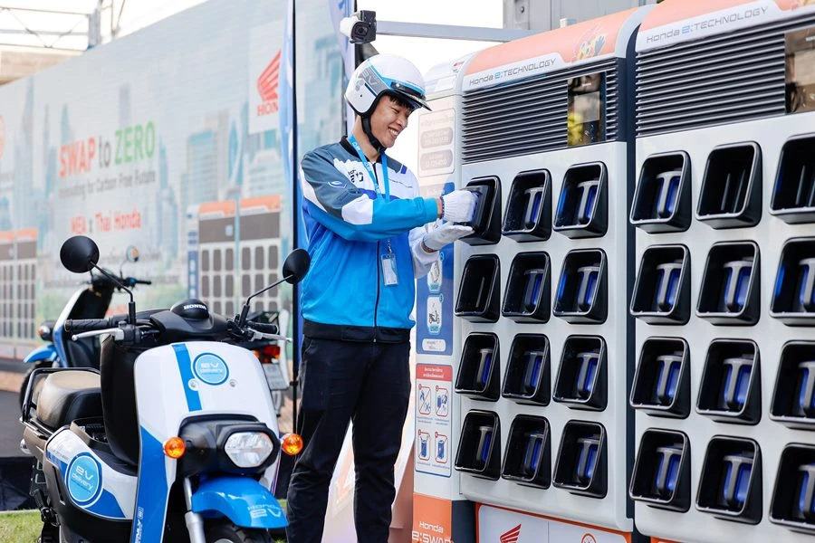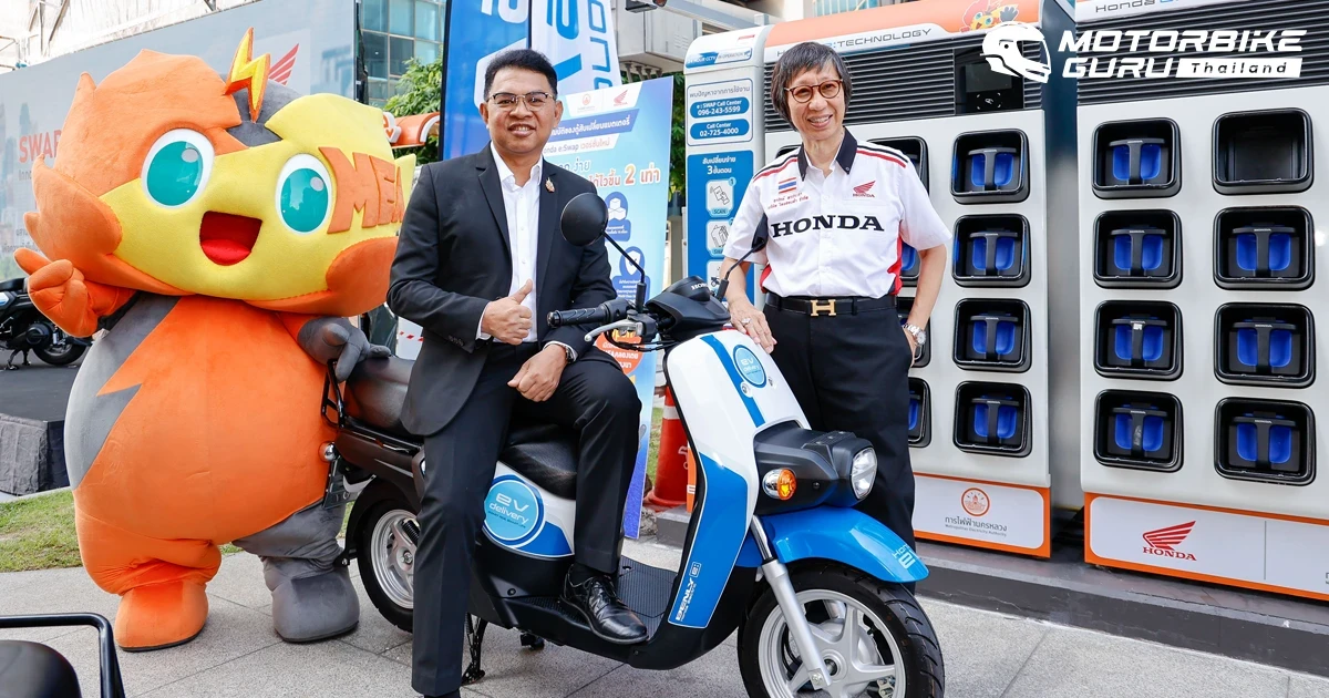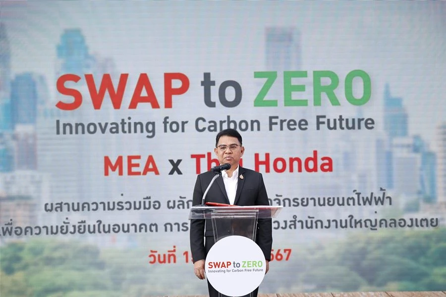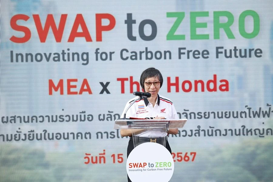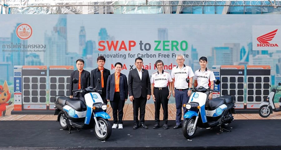 นายวิลาศ เฉลยสัตย์ ผู้ว่าการ MEA หรือ การไฟฟ้านครหลวง เป็นประธาน เปิดงาน SWAP to ZERO: Innovating for Carbon-free future ร่วมด้วย ดร.อารักษ์ พรประภา ประธาน บริษัท ไทยฮอนด้า จำกัด ประกาศความร่วมมือใน โครงการร่วมมือศึกษาความเป็นไปได้ทางธุรกิจ และทดลองการให้บริการสถานีสับเปลี่ยนแบตเตอรี่ ระหว่าง การไฟฟ้านครหลวง และ บริษัท ไทยฮอนด้า จำกัด ที่ได้ร่วมกันพัฒนาแนวทางความเป็นไปได้ และรูปแบบการศึกษาวิจัยทดลองเพื่อผลักดันให้เกิดการใช้งานรถจักรยานยนต์ไฟฟ้าในประเทศไทยอย่างยั่งยืนในอนาคต ณ สถานีสับเปลี่ยนแบตเตอรี่ การไฟฟ้านครหลวง (สำนักงานใหญ่) คลองเตย