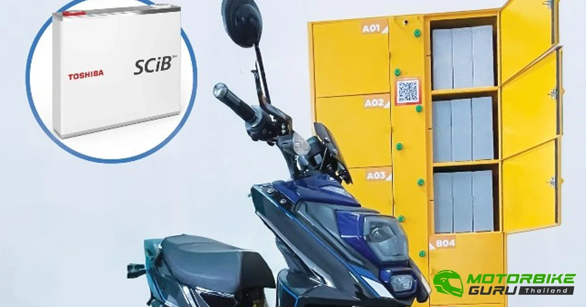 ชุดแบตเตอรี่ที่ใช้เซลล์ SCiB™ และตู้ล็อกเกอร์สำหรับชาร์จแบตเตอรี่ที่ใช้ในการทดสอบพร้อมด้วยรถมอเตอร์ไซค์