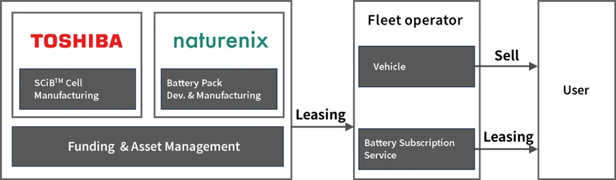 เนเจอร์นิกซ์จะปล่อยเช่าแบตเตอรี่ให้กับลูกค้าที่เป็นผู้ขับขี่รถมอเตอร์ไซค์ไฟฟ้าในรูปแบบระบบสมาชิกผ่านผู้ประกอบการฟลีต วิธีนี้ช่วยให้ผู้ประกอบการฟลีตจัดหารถมอเตอร์ไซค์ไฟฟ้าให้ลูกค้าได้โดยไม่ต้องแบกรับค่าแบตเตอรี่ ช่วยลดต้นทุนเริ่มแรกที่เป็นอุปสรรคสูงในการเปลี่ยนมาใช้พลังงานไฟฟ้า ส่วนโตชิบา ซึ่งเป็นผู้ผลิตแบตเตอรี่ คาดว่าจะมีรายได้ต่อเนื่องทั้งจากค่าเช่าแบตเตอรี่และจากการผลิตและการจำหน่าย