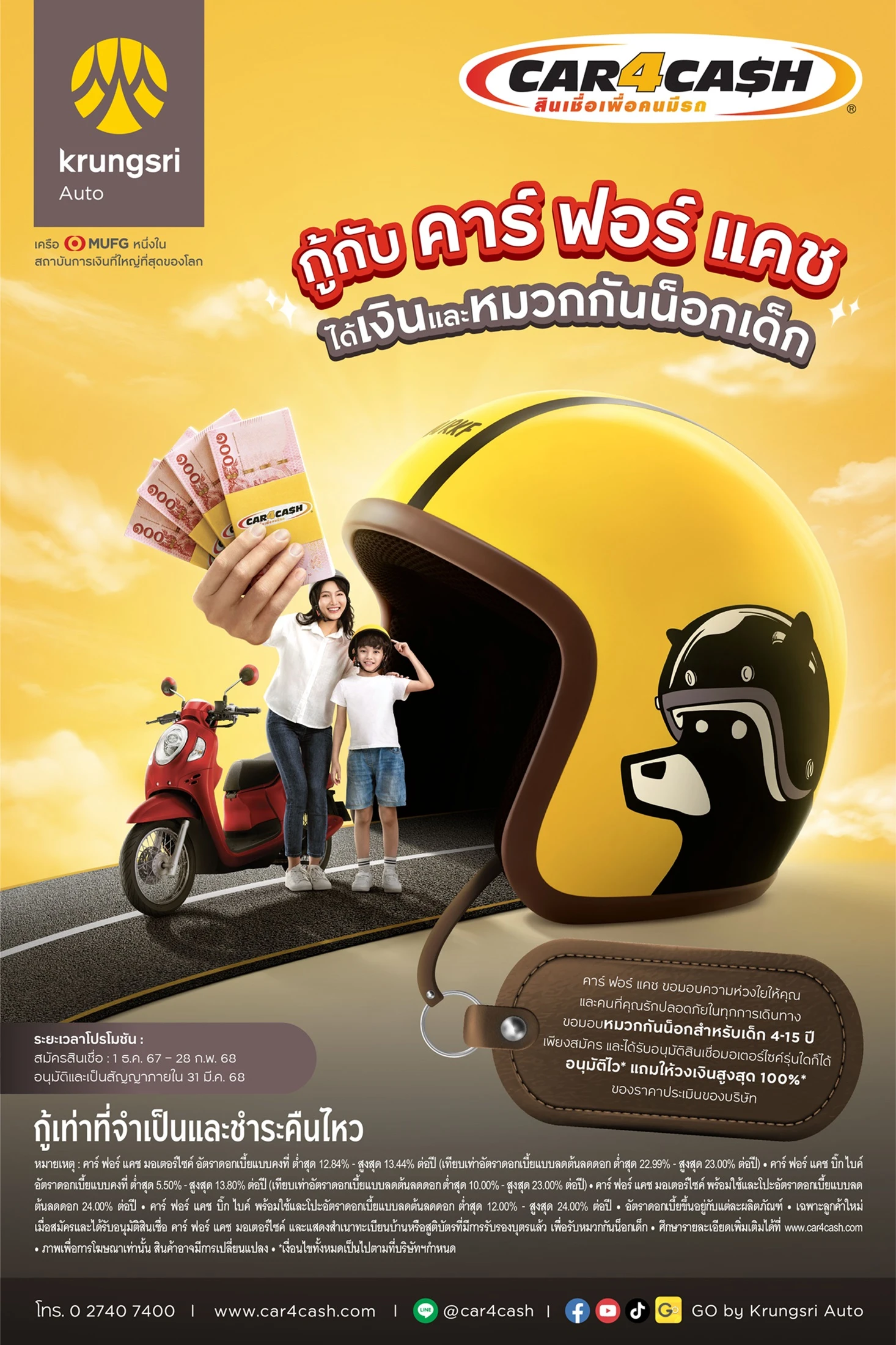 คาร์ ฟอร์ แคช ผู้นำตลาดสินเชื่อเพื่อคนมีรถ ส่งต่อความห่วงใยไปยังผู้ใช้รถผ่านแคมเปญพิเศษ กู้กับ คาร์ ฟอร์ แคช มอเตอร์ไซค์ ได้ทั้งเงิน ได้ทั้งหมวกกันน็อกเด็ก หวังสร้างความตระหนักด้านความปลอดภัยขณะขับขี่บนท้องถนนสำหรับผู้ใช้และผู้ซ้อนรถมอเตอร์ไซค์ โดยเฉพาะกับเด็กและเยาวชนซึ่งเป็น 1 ใน 5 ของผู้เสียชีวิตจากอุบัติเหตุทางถนน ลูกค้าที่สมัครสินเชื่อ คาร์ ฟอร์ แคช มอเตอร์ไซค์ และ คาร์ ฟอร์ แคช บิ๊ก ไบค์ ในระหว่างวันที่ 1 ธันวาคม 2567 – 28 กุมภาพันธ์ 2568 และได้รับอนุมัติเป็นสัญญาภายในวันที่ 31 มีนาคม 2568 จะได้รับหมวกกันน็อกสำหรับเด็ก ซึ่งเป็นผลงานการออกแบบร่วมกันระหว่าง กรุงศรี ออโต้ x Rubber Killer ตามแนวคิด Better Everyday Life ชีวิตดีขึ้น ได้ทุกวัน เพียงสวมหมวกกันน็อกทุกครั้ง ก่อนการเดินทาง ไม่ว่าใกล้ หรือไกล เพื่อมีส่วนช่วยป้องกันอุบัติเหตุที่อาจจะเกิดขึ้นกับผู้ขับขี่มอเตอร์ไซค์