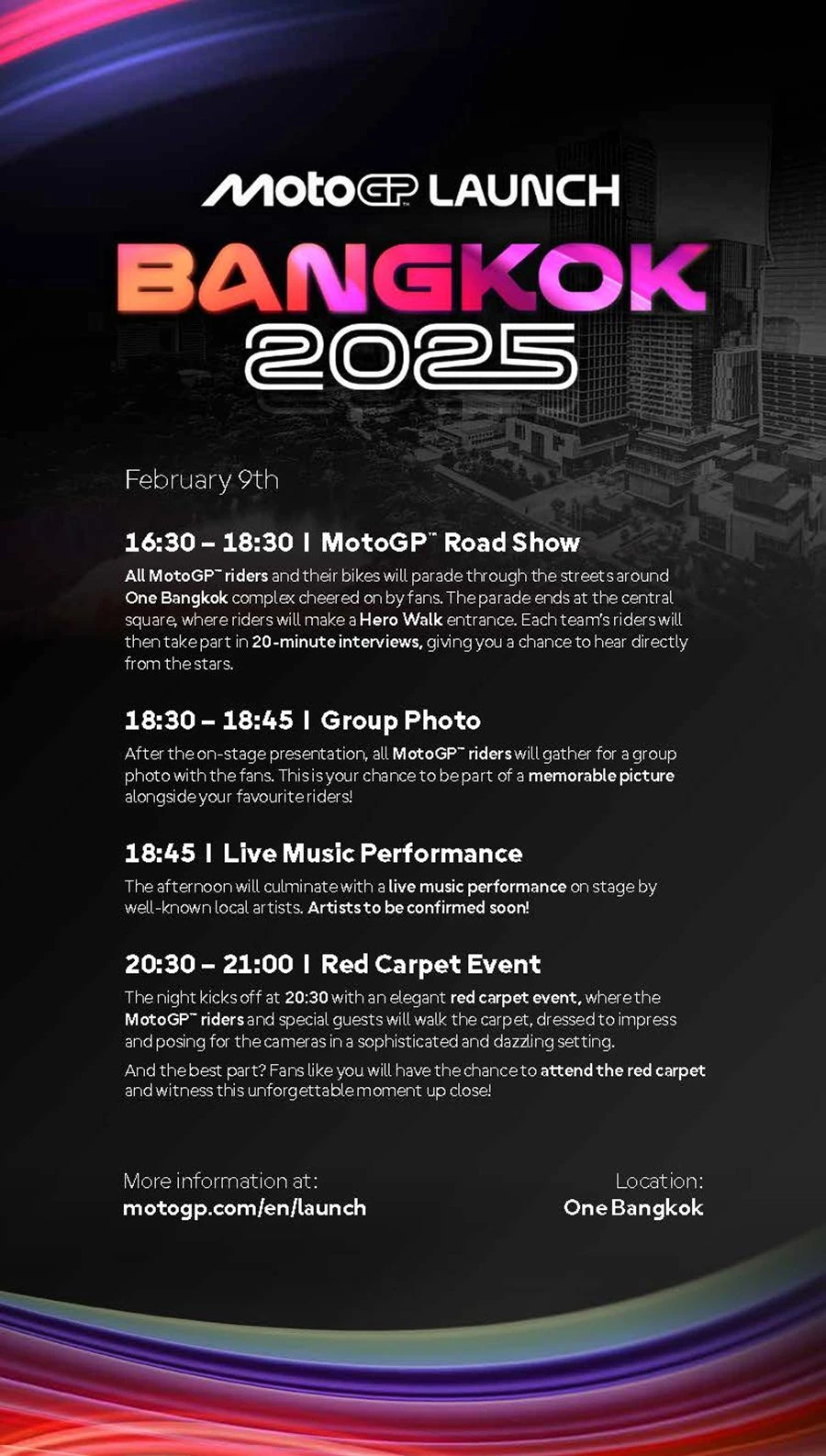 กิจกรรม MotoGP season launch วันที่ 9 กพ. 2568 ที่ One Bangkok กรุงเทพ จะถ่ายทอดสดไปทั่วโลก ส่งมอบประสบการณ์สุดเอ็กซ์คลูซีฟให้กับแฟนความเร็วมากมาย อาทิ การจัดแสดงรถแข่งให้แฟนความเร็วได้ชมอย่างใกล้ชิดตลอดทั้งวัน