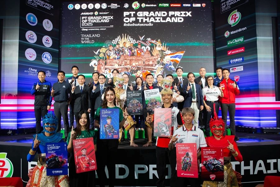 นายพงศธร เอื้อมงคลชัย ประธานกรรมการบริหาร, นายภาณุพล กิตติคำรณ ผู้จัดการใหญ่ด้านการค้า, นายอุกฤษณ์ ภาควิวรรธ รองผู้จัดการใหญ่ด้านวางแผนการค้า และการตลาด บริษัท ไทยยามาฮ่ามอเตอร์ จำกัด ถ่ายภาพร่วมกับ นายกฤษฎา ตันเทอดทิตย์ เลขานุการรัฐมนตรีว่าการกระทรวงการท่องเที่ยวและกีฬา, ดร.ก้องศักด ยอดมณี ผู้ว่าการการกีฬาแห่งประเทศไทย, นายโชติชนก ชิดชอบ ผู้อำนวยการฝ่ายกิจกรรมต่างประเทศ สนามช้าง อินเตอร์เนชั่นแนลเซอร์กิต, นายพิทักษ์ รัชกิจประการ ประธานเจ้าหน้าที่บริหาร และกรรมการผู้จัดการใหญ่ บริษัท พีทีจี เอ็นเนอยี จำกัด (มหาชน) และมร.มาร์กอส ตอร์โรบา ผู้จัดการด้านการจัดการแข่งขัน ดอร์น่า สปอร์ต เจ้าของลิขสิทธิ์การแข่งขัน ในงานแถลงข่าวการจำหน่ายบัตรชมการแข่งขัน MotoGP สนามประเทศไทย
