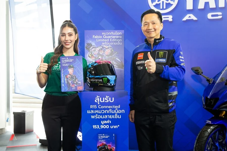 พร้อมกันนี้ยามาฮ่า ยังจัดหนักแคมเปญเด็ดลุ้นรับรถจักรยานยนต์ Yamaha R15 Connected มูลค่า 118,000 บาท พร้อมหมวกกันน็อก HJC RPHA1 QUARTARARO LE MANS SPECIAL 2024 Limited Edition พร้อมลายเซ็นจาก ฟาร์บิโอ กวาร์ตาราโร่ ให้กับแฟนๆ มอเตอร์สปอร์ตชาวไทย เมื่อซื้อบัตร Yamaha Stand ทุกที่นั่ง