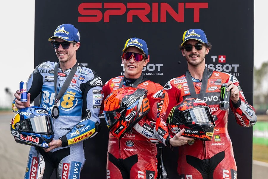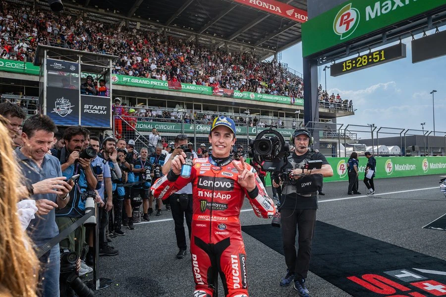 ศึกนี้พี่น้อง! มาร์ค มาร์เกซ แชมป์โลก 8 สมัยชาวสแปนิชจาก ดูคาติ เลอโนโว ทีม นำม้วนเดียวจบผงาดคว้าชัย สปรินต์เรซ เหนือคู่แข่งอย่าง อเล็กซ์ มาร์เกซ น้องชาย จาก เกรซินี เรซซิ่ง และทีมเมทในทีมโรงงานอย่าง ฟรานเชสโก้ บันยาญ่า ขณะ ก้อง-สมเกียรติ จันทรา นักบิดโมโตจีพีชาวไทยคนแรกจากฮอนด้า ประเดิมเรซแรกอย่างเป็นทางการด้วยผลงานน่าพอใจ ภายใต้เสียงเชียร์กระหึ่มของแฟนมอเตอร์สปอร์ตในบ้านเกิด