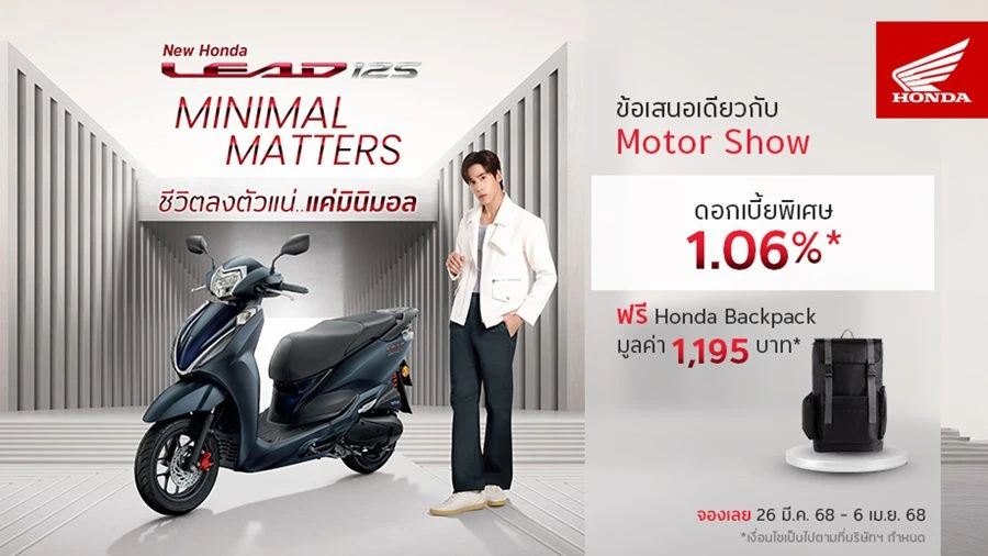 ตามมาด้วย New Honda Lead125 รถจักรยานยนต์คู่ใจสายมินิมอล รุ่น Special Edition สีเทาใหม่ (Matte Gray) วางจำหน่ายพร้อมกับ สีดำ (Black) ด้วยดอกเบี้ยพิเศษ 1.06% แถมฟรี Honda Backpack มูลค่า 1,195 บาท ราคาแนะนำที่ 62,500 บาท