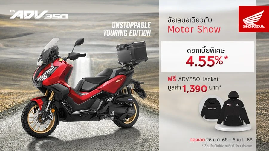 สายแอดเวนเจอร์ต้องไม่พลาดกับ New Honda ADV350 และ New Honda ADV350 Touring Edition ที่ให้ดอกเบี้ยพิเศษ 4.55% พร้อมรับฟรี ADV350 Jacket มูลค่า 1,390 บาท โดยรุ่น New Honda ADV350 ราคาแนะนำที่ 189,900 บาท และรุ่น Touring Edition ราคาแนะนำที่ 204,000 บาท