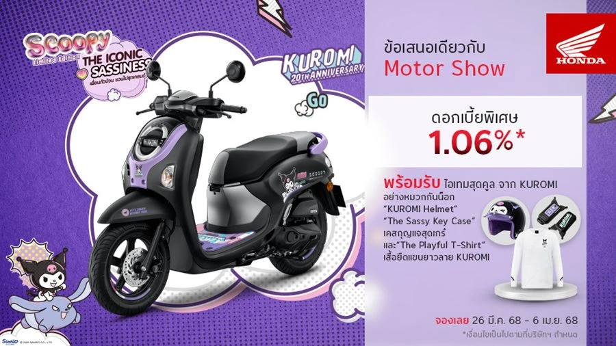 โปรโมชันสำหรับรถคอมมูเตอร์ นำขบวนโดยรถจักรยานยนต์ที่สายแฟห้ามพลาด All New Honda Scoopy x Kuromi Limited Edition ด้วยดีไซน์สุดน่ารักและดอกเบี้ยพิเศษ 1.06% พร้อมด้วยของพรีเมียมสุดเอ็กซ์คลูซีฟจาก KUROMI ได้แก่ หมวกกันน็อก KUROMI Helmet, เคสกุญแจลายพิเศษ The Sassy Key Case, เสื้อยืดลิมิเต็ด The Playful T-Shirt และกระเป๋าสะพายสุดชิค ในราคาแนะนำเพียง 60,800 บาทเท่านั้น!