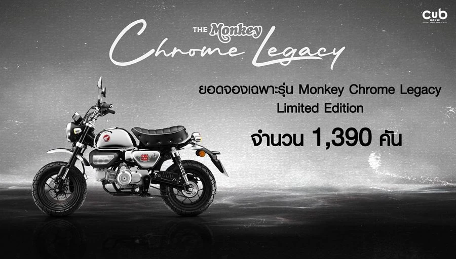 New Honda Monkey Chrome Legacy โมเดลพิเศษที่ได้รับการออกแบบเพื่อเฉลิมฉลองวาระครบรอบ 60 ปีของไทยฮอนด้า ถ่ายทอดความคลาสสิกของเจ้าลิงซนในสไตล์โครเมียมเต็มคัน ทั้งถังน้ำมัน ฝาครอบข้าง และองค์ประกอบต่าง ๆ ที่ได้รับการตกแต่งอย่างประณีต เสริมความโดดเด่นด้วยเบาะหนังสีดำและหมุดสแตนเลสสุดหรู พร้อม 3D Soft Emblem ลายเจ้าลิงซนฉลอง 60 ปี และ Chrome Edition Serial Number ที่รันหมายเลขเฉพาะให้กับแต่ละคัน