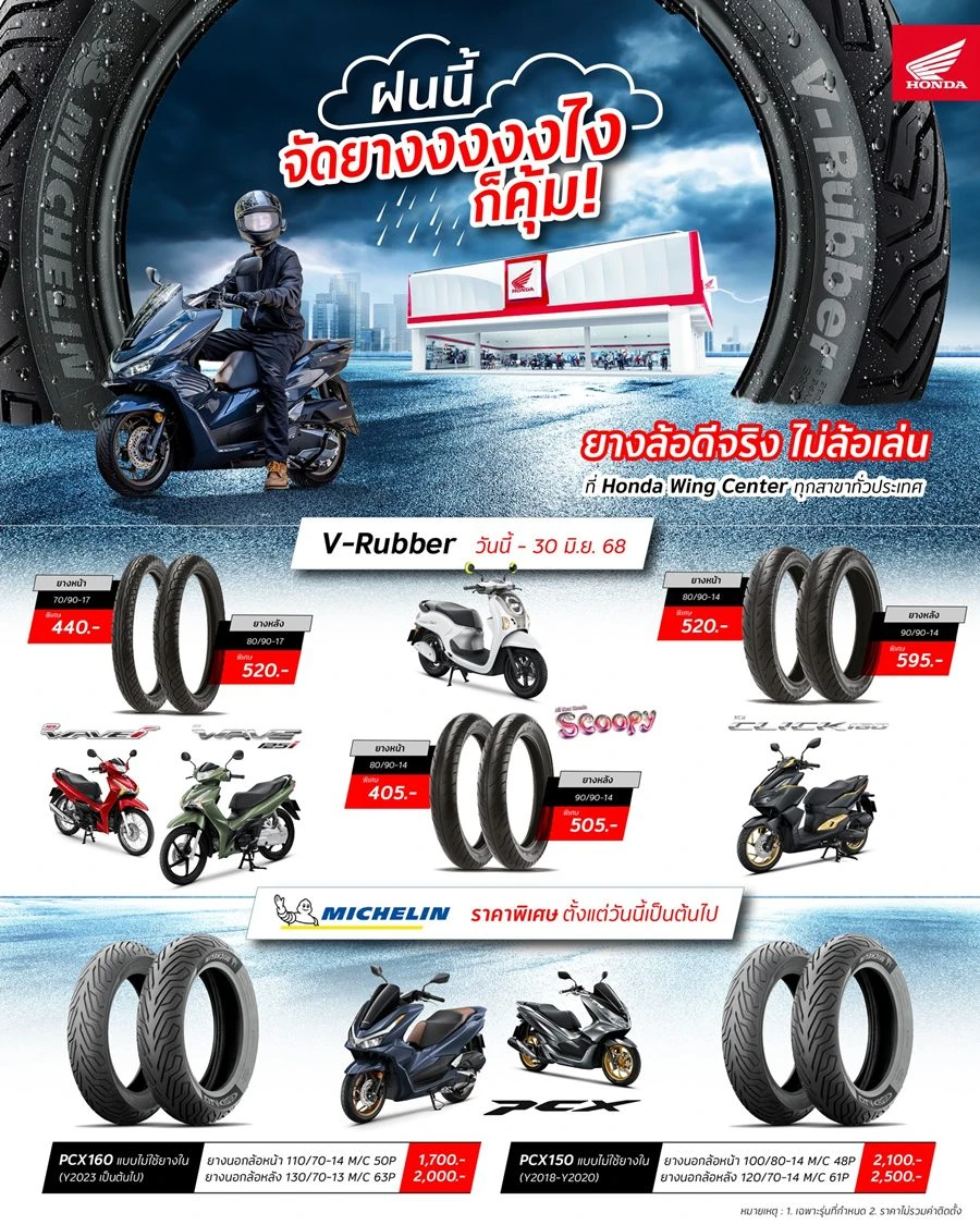 รถจักรยานยนต์ฮอนด้า พร้อมมอบข้อเสนอสุดพิเศษสำหรับลูกค้าในช่วงหน้าฝน ด้วยโปรโมชั่นยางล้อคุณภาพจากสองแบรนด์ชั้นนำอย่าง V-Rubber และ Michelin ที่เน้นความคุ้มค่า ทั้งในเรื่องราคาและสมรรถนะการใช้งาน ช่วยเพิ่มความมั่นใจในการยึดเกาะถนนเปียกลื่น เพื่อเสริมความปลอดภัยในการขับขี่ในฤดูฝน โปรโมชั่นนี้เริ่มตั้งแต่วันที่ 29 พฤษภาคม ถึง 30 มิถุนายน 2568 เท่านั้น