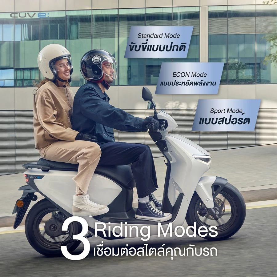 New Honda CUV e: มีโหมดขับขี่ให้เลือก 3 แบบ ได้แก่ ECON, Normal และ Sport ยังมาพร้อม ระบบ Reverse Assist สำหรับช่วยถอยหลังในพื้นที่จำกัด และขับขี่มั่นใจด้วยระบบช่วยกระจายแรงเบรก CBS (Combine Braking System) มีทั้งหมด 2 รุ่น ได้แก่ รุ่น Standard และ รุ่น Connectivity มีให้เลือกทั้งหมด 2 สี ได้แก่ สีดำ (Mat Gunpowder Black Metallic) และ สีขาว (Pearl Jubilee White) ราคาเช่าเริ่มต้น 3,500 บาท/เดือน โดย New Honda CUV e: พร้อมให้คนไทยสัมผัสประสบการณ์การขับขี่ได้จริงแล้ววันนี้ ลงทะเบียนเช่าใช้งานและดูรายละเอียดเพิ่มเติมได้ที่ https://bit.ly/4hvNzqD