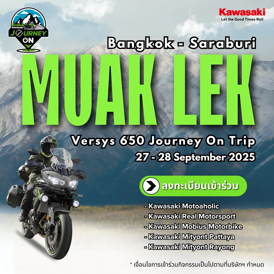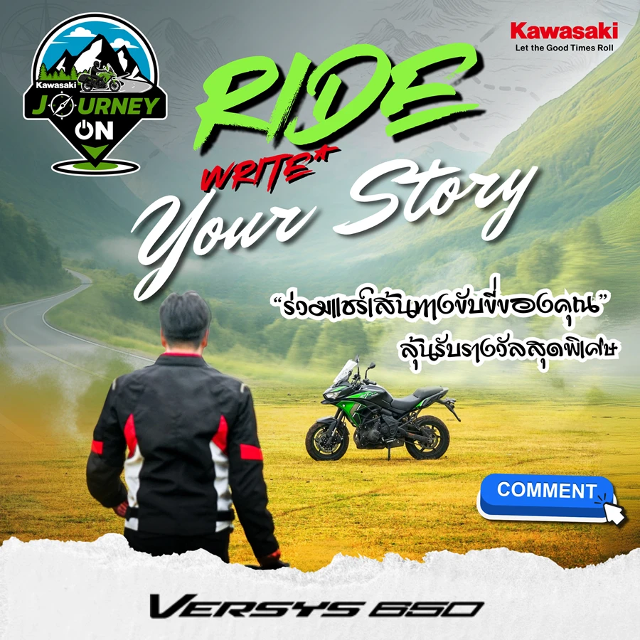 เก็บเกี่ยวประสบการณ์ท่องเที่ยวกันมาอิ่มหนำแล้ว คาวาซากิอยากเชิญชวนชาว Versys650 ทุกท่าน มาร่วมแชร์ประสบการณ์เส้นทาง และความประทับใจจากการเดินทางในสถานที่ต่างๆ พร้อมแนบภาพประกอบเรื่องราวใต้โพสต์ที่บริษัทฯกำหนด เรื่องราวที่ถูกใจคณะกรรมการที่สุดจะได้สิทธิเข้าร่วมทริป Versys650 Journey On, Laos Chapter ฟรี และยังมีรางวัลรองชนะเลิศอีก 4 รางวัล เป็นเสื้อเจอร์ซีย์สวยๆดีไซน์พิเศษเพื่อแคมเปญ Journey On โดยเฉพาะ งานนี้ร่วมสนุกได้ตั้งแต่วันที่ 30 สิงหาคม – 31 ตุลาคม พ.ศ. 2568 ประกาศผลรางวัลในวันที่ 5 พฤศจิกายน พ.ศ. 2568 แต่ถ้าใครพลาดรางวัลจากกิจกรรมนี้ ยังมีกิจกรรมสำหรับชาวโซเชียลออกมาเพิ่มเติมในอนาคตอีกอย่างแน่นอน กดรีเฟรชที่หน้าเพจ Kawasaki Motors Thailand รอไว้ได้เลย