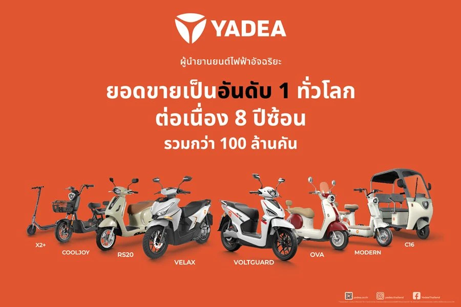 YADEA (ออกเสียงว่า ยา-เดีย) เป็น แบรนด์มอเตอร์ไซค์ไฟฟ้าที่มียอดขายสูงสุดในโลกติดต่อกัน 8 ปีซ้อน (ตั้งแต่ปี 2017– ปี 2024) มียอดขายสะสมกว่า 120 ล้านคัน และมีโรงงานกว่า 10 แห่งทั่วโลก ทั้งในประเทศจีน ไทย อินโดนีเซีย เวียดนาม เม็กซิโก และบราซิล โดยมีสายการผลิตอัจฉริยะรวมกว่า 100 สาย ผลิตได้สูงสุด 30 ล้านคันต่อปี ด้วยระบบอัตโนมัติประสิทธิภาพสูงและความเร็วในการผลิตที่เหนือชั้นจึงสามารถผลิตรถได้ 1 คันในทุกๆ 25 วินาที และคุณภาพผ่านเกณฑ์การผลิตกว่า 99.9% สะท้อนมาตรฐานการผลิตระดับโลก