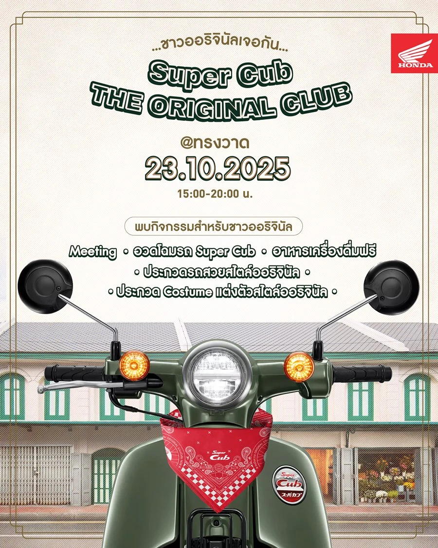 รถจักรยานยนต์ฮอนด้า เชิญชวนเหล่าสาวกผู้หลงใหลในเสน่ห์ความคลาสสิกของ Super Cub มารวมพลเฉลิมฉลองความออริจินัลในงาน “Super Cub THE ORIGINAL CLUB MEETING” การพบปะสุดพิเศษของคนรัก Super Cub ที่จะได้มาร่วมสร้างประสบการณ์เหนือระดับไปด้วยกัน ในวันพฤหัสบดีที่ 23 ตุลาคม 2568 เวลา 15.00 – 20.00 น. ณ Mahapho Riverview อีเวนต์สเปซสุดอาร์ตริมแม่น้ำเจ้าพระยา ย่านทรงวาด เปิดให้ลงทะเบียนเข้าร่วมงานฟรีแล้วตั้งแต่วันนี้