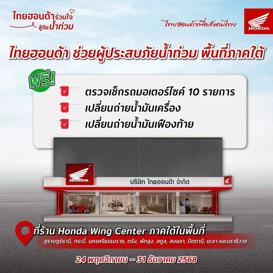 ไทยฮอนด้า ผู้ผลิตและจัดจำหน่ายรถจักรยานยนต์และเครื่องยนต์อเนกประสงค์ฮอนด้าในประเทศไทย เดินหน้าช่วยเหลือประชาชนในพื้นที่ภาคใต้ที่ได้รับผลกระทบจากอุทกภัย ภายใต้โครงการ ไทยฮอนด้าร่วมใจสู้ภัยน้ำท่วม โดยจัดให้บริการตรวจเช็กและซ่อมรถจักรยานยนต์ฮอนด้าโดยไม่มีค่าใช้จ่าย ณ เครือข่ายร้านผู้จำหน่ายที่เข้าร่วมโครงการ ครอบคลุมทั้ง Honda Wing Center, ศูนย์บริการ Honda BigWing และ ร้าน CUB House ใน 10 จังหวัดภาคใต้ที่ได้รับผลกระทบ เพื่อบรรเทาความเดือดร้อนเร่งด่วน และช่วยให้ผู้ใช้รถกลับมาใช้งานได้อย่างปลอดภัยโดยเร็วที่สุด