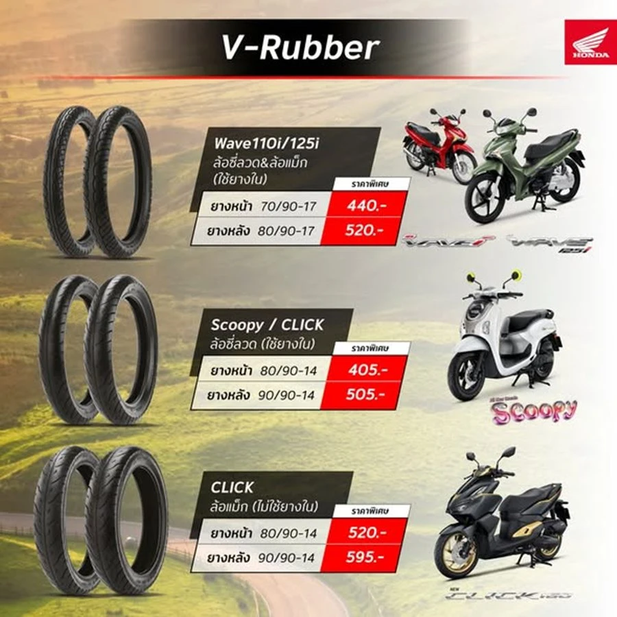 โปรโมชัน ยางไงก็คุ้ม คัดสรรยางที่เหมาะสมกับรถจักรยานยนต์ฮอนด้าหลากหลายรุ่น ครอบคลุมทั้งรถครอบครัวและรถออโตเมติก ตอบโจทย์การใช้งานจริงทั้งด้านคุณภาพ ความทนทาน และความคุ้มค่า โดยมีรายละเอียดดังนี้