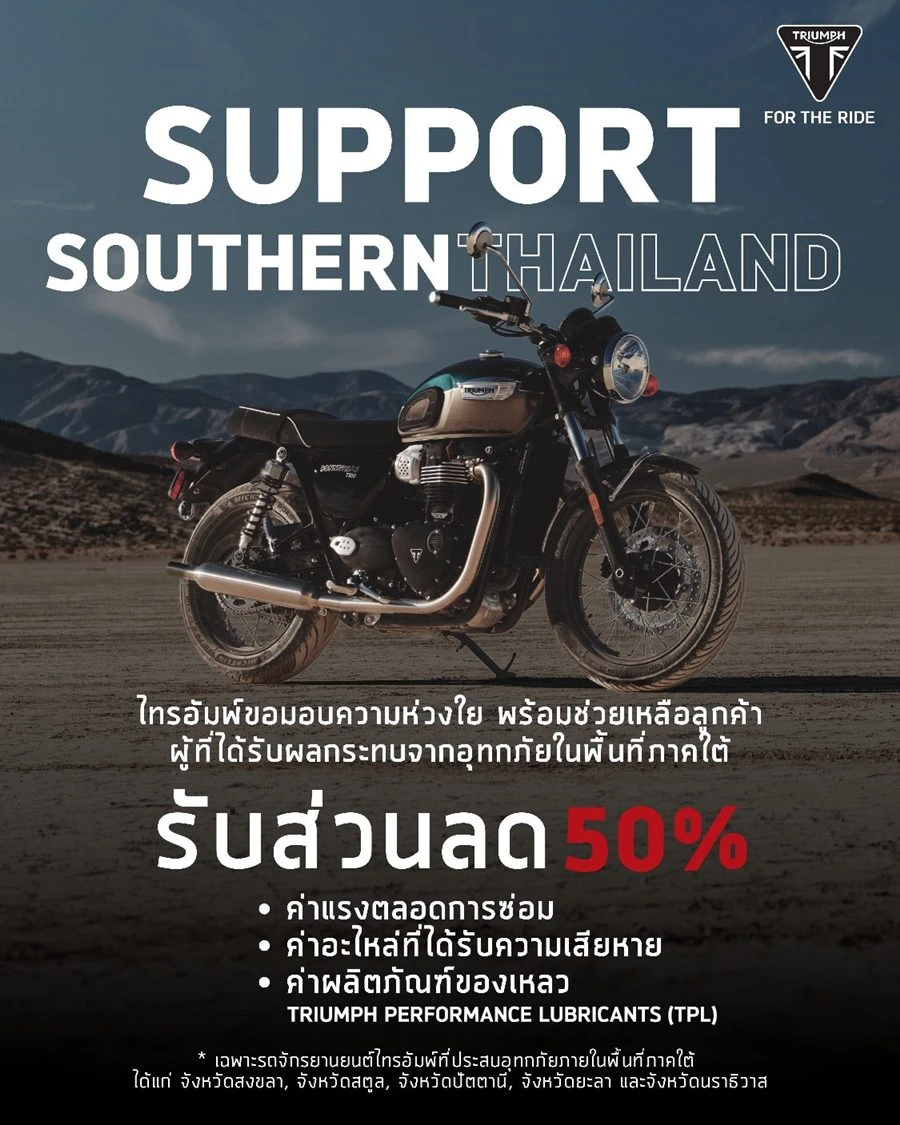 ไทรอัมพ์ มอเตอร์ไซเคิลส์ พร้อมด้วย ไทรอัมพ์ หาดใหญ่ เดินหน้าการให้ความช่วยเหลือในระยะฟื้นฟูแก่ลูกค้าไทรอัมพ์ในพื้นที่ภาคใต้ ที่ได้รับผลกระทบจากภัยพิบัติอุทกภัยครั้งใหญ่ช่วงปลายปี 2568 ด้วยการมอบมาตรการพิเศษสำหรับซ่อมแซมรถจักรยานยนต์ เพื่อช่วยบรรเทาความเดือดร้อนในเรื่องค่าใช้จ่าย และสนับสนุนให้ลูกค้าสามารถนำรถจักรยานยนต์กลับมาใช้ดำเนินกิจกรรมต่าง ๆ ในชีวิตประจำวันได้ตามปกติ