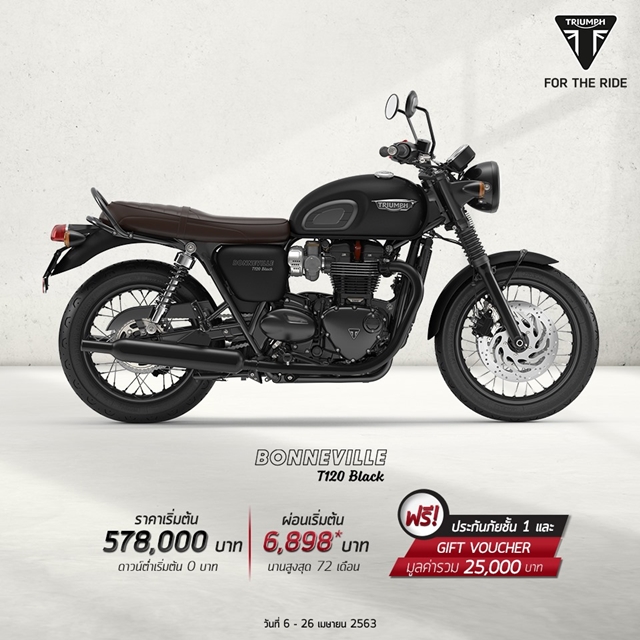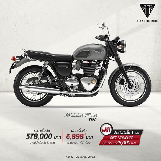 บอนเนวิลล์ ที120 และ บอนเนวิลล์ ที120 แบล็ค (Bonneville T120 & Bonneville T120 Black) ราคาเริ่มต้นที่ 578,000 บาท รับฟรี Gift Voucher แทนเงินสดมูลค่า 20,000 บาท พร้อม Gift Voucher สำหรับเสื้อผ้า มูลค่า 5,000 บาท รวมถึงประกันภัยชั้น 1