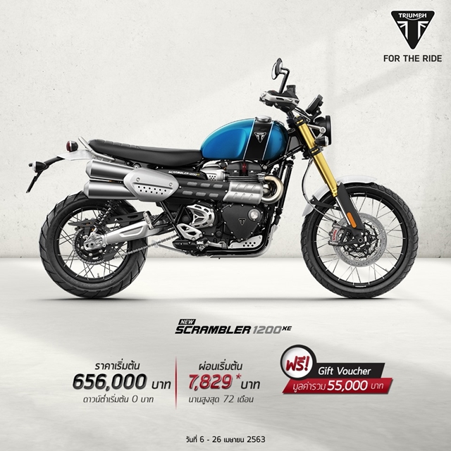 - สแครมเบลอร์ 1200 เอ็กซ์ซี (Scrambler 1200 XC) ราคา 613,000 บาท และ สแครมเบลอร์ 1200 เอ็กซ์อี (Scrambler 1200 XE) ราคา 656,000 บาท มอเตอร์ไซค์โมเดิร์นคลาสสิกที่เป็นที่สุดของการขับขี่เพื่อสายลุยตัวจริง รับฟรีทันที Gift Voucher แทนเงินสดมูลค่า 50,000 บาท พร้อม Gift Voucher สำหรับเสื้อผ้า มูลค่า 5,000 บาท