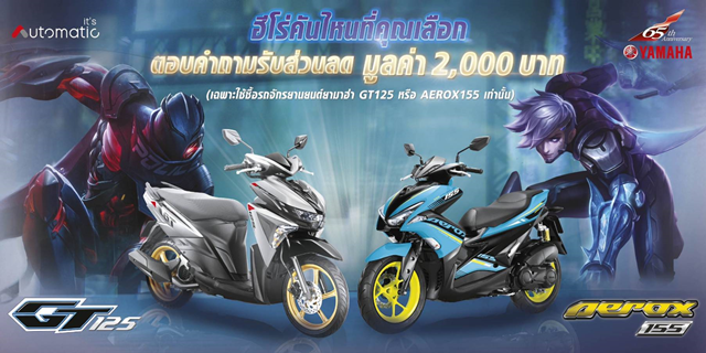 บริษัท ไทยยามาฮ่ามอเตอร์ จำกัด ร่วมกับพันธมิตรเกมออนไลน์ยักษ์ใหญ่ บริษัท การีนา ออนไลน์ (ประเทศไทย) จำกัด จัดกิจกรรมส่งเสริมการขาย 'ฮีโร่คันไหนที่คุณเลือก?' ในเกมออนไลน์ชื่อดัง RoV แจกคูปองซื้อรถจักรยานยนต์ยามาฮ่า สไตล์ SPORT AUTOMATIC มูลค่า 2,000 บาท