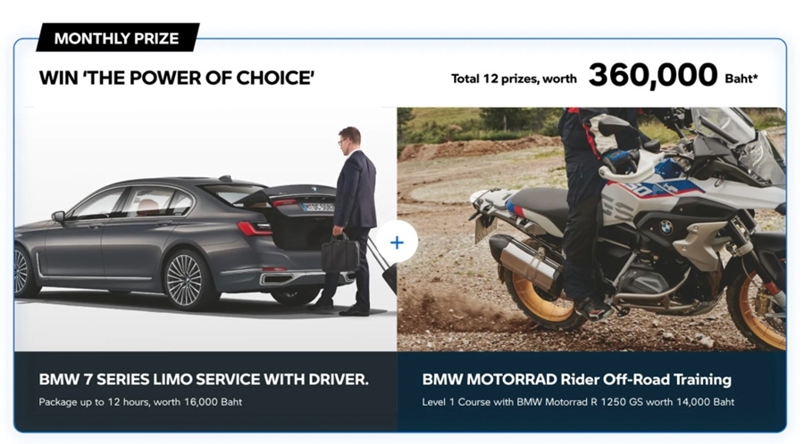 ตั้งแต่ พ.ค. 64 - เม.ย. 65 ออกรถและทำสัญญา BMW MOTORRAD เดือนไหน คุณสามารถลุ้นของรางวัลประจำเดือนนั้น “Power of Choice” 12 รางวัล มูลค่ารวม 360,000 บาท